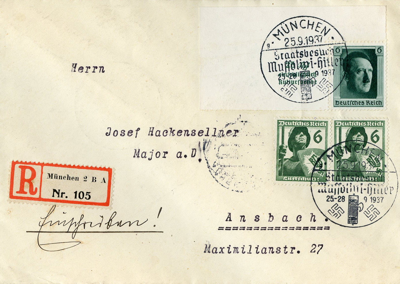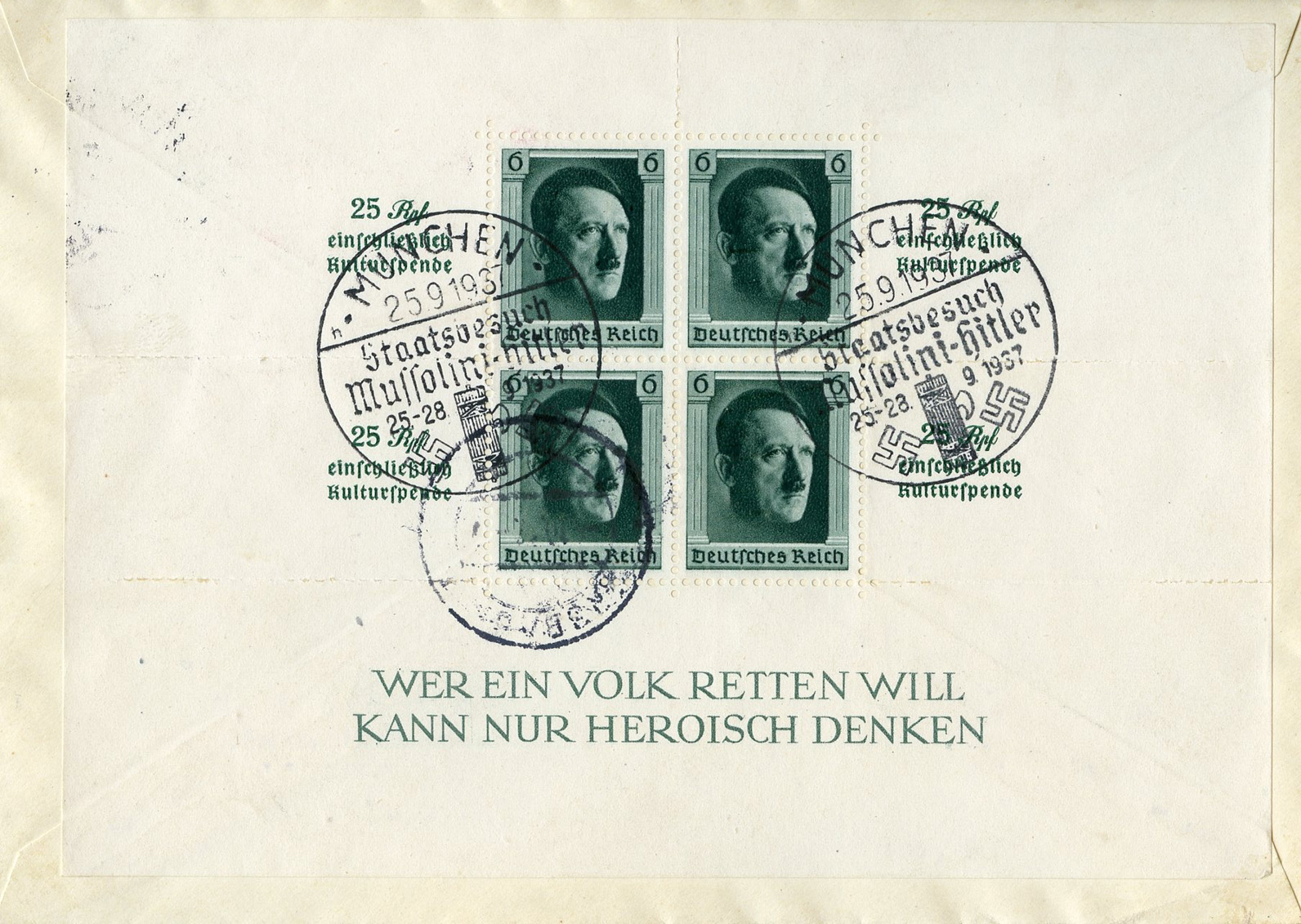 [Below: This envelope, using the perforated (with donation print) version of the sourvenir sheet, was postmarked in Munich on September 25, 1937 and sent to Ansbach, Bavaria. The cancel commemorates Mussolini's visit to Germany. It says 'Staatsbesuch Mussolini-Hitler' (Mussolini-Hitler State Visit).]