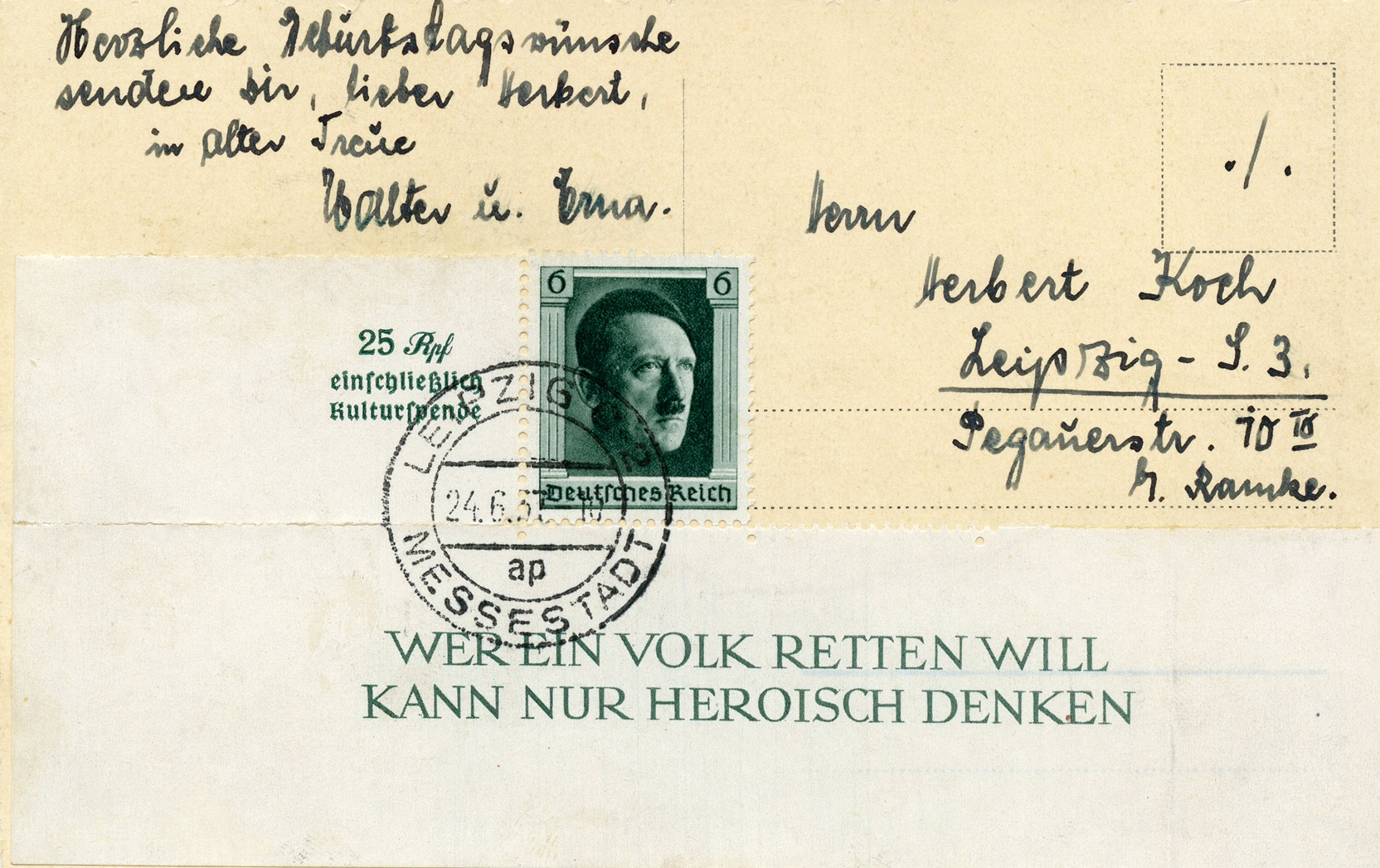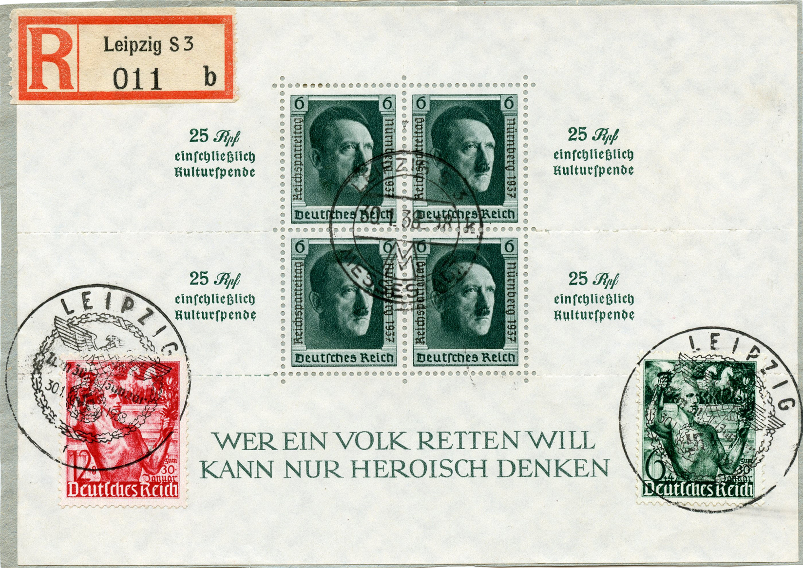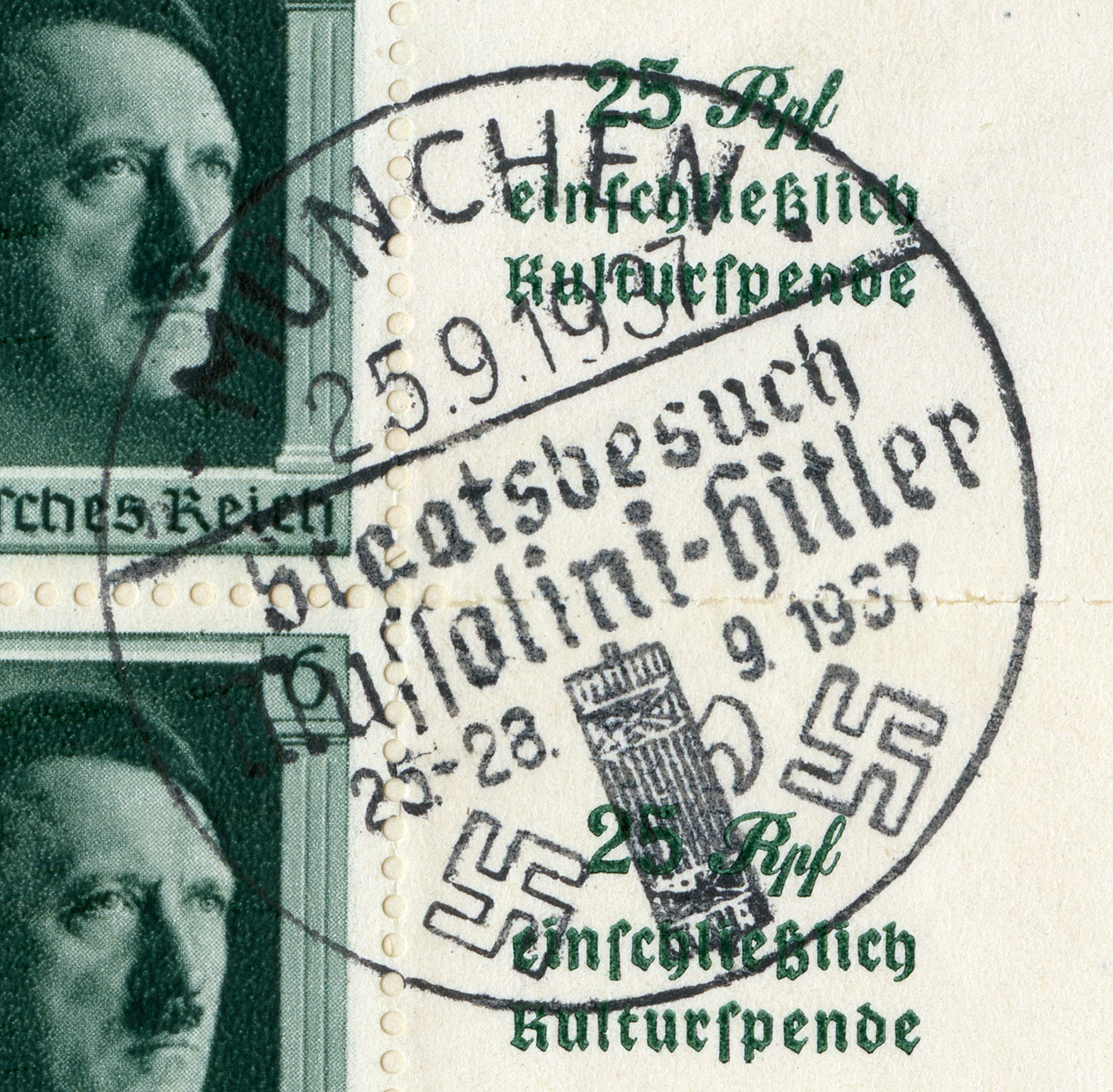 einschließlich Kulturspende' (25 Rpf including cultural donation). This was issued in celebration of the 9th Reich Party Day.]
