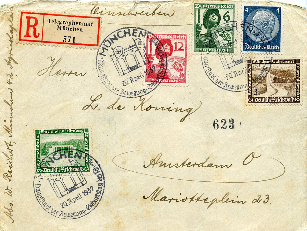[Below: This envelope was postmarked in Munich on April 20, 1937 and sent to Amsterdam. It uses the original perforated sourvenir sheet plus an additional one Pfennig Hindenberg stamp.]