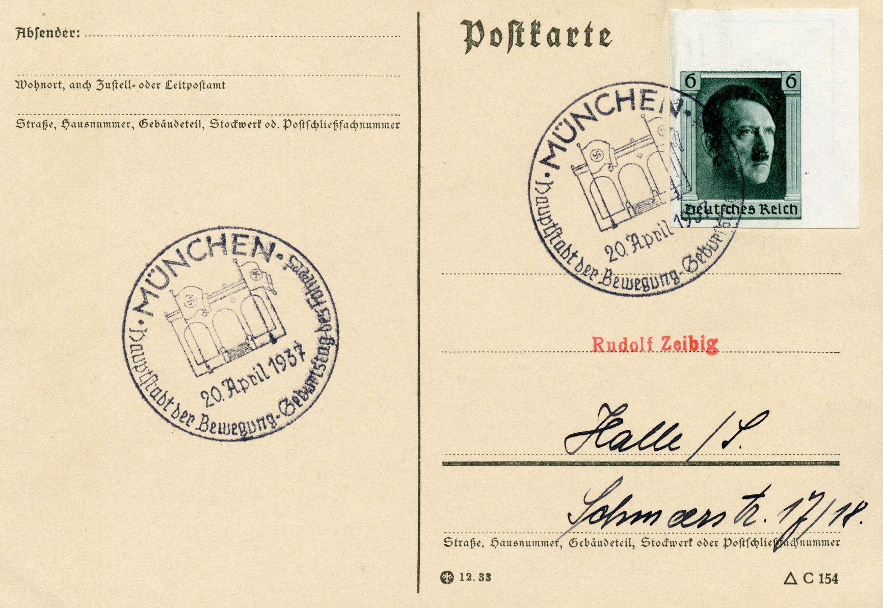 [Below: Postcard using a partial sheet, from architect and master builder Fritz Paeplow, postmarked on April 20, 1937.]