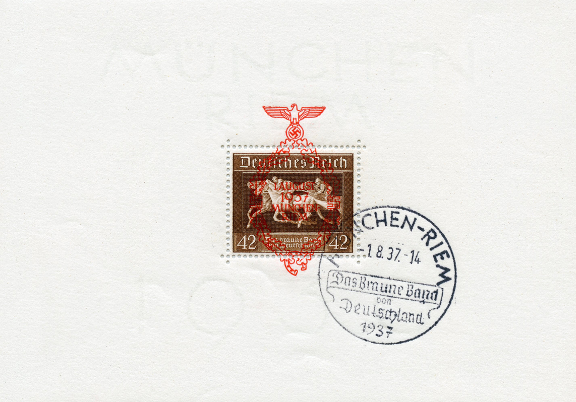 [Below: Here is an unused souvenir sheet with perforations and 1937 Reichsparteitag overprint.]