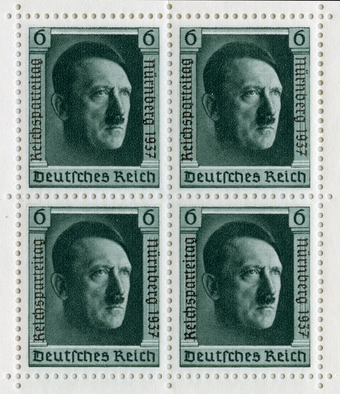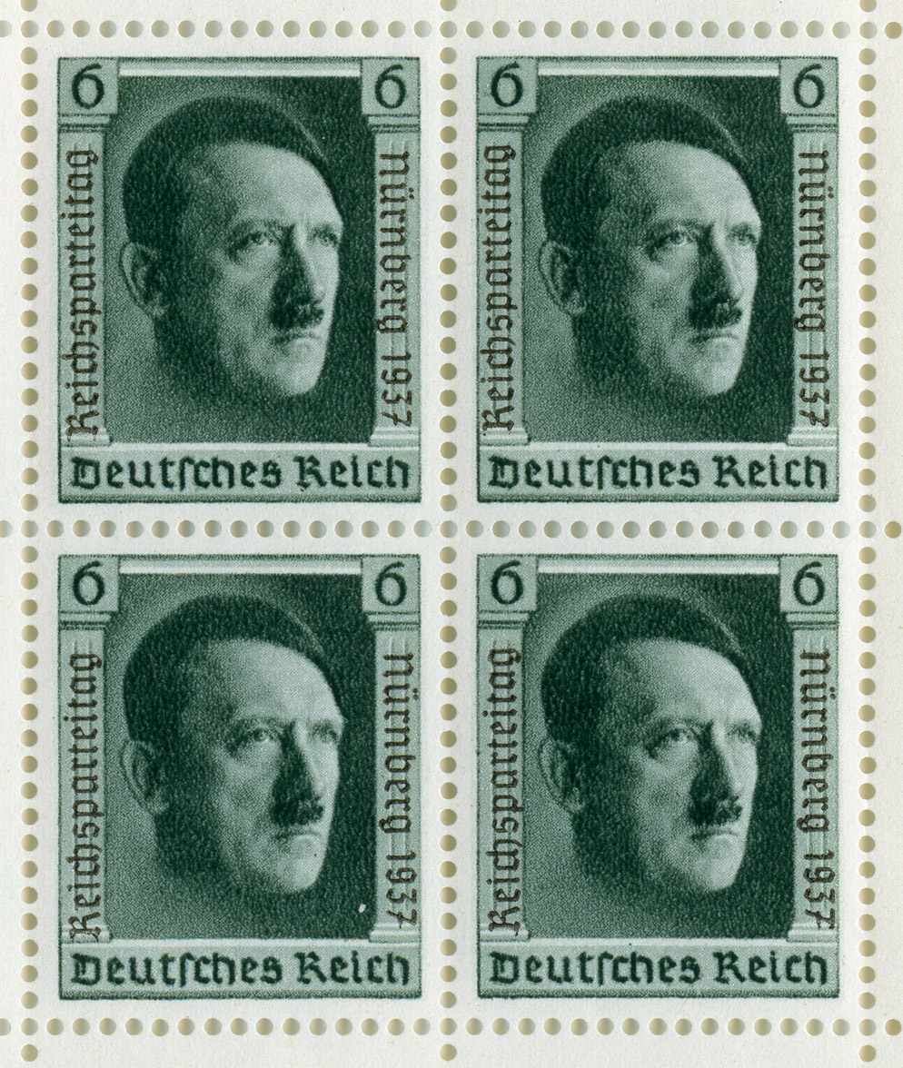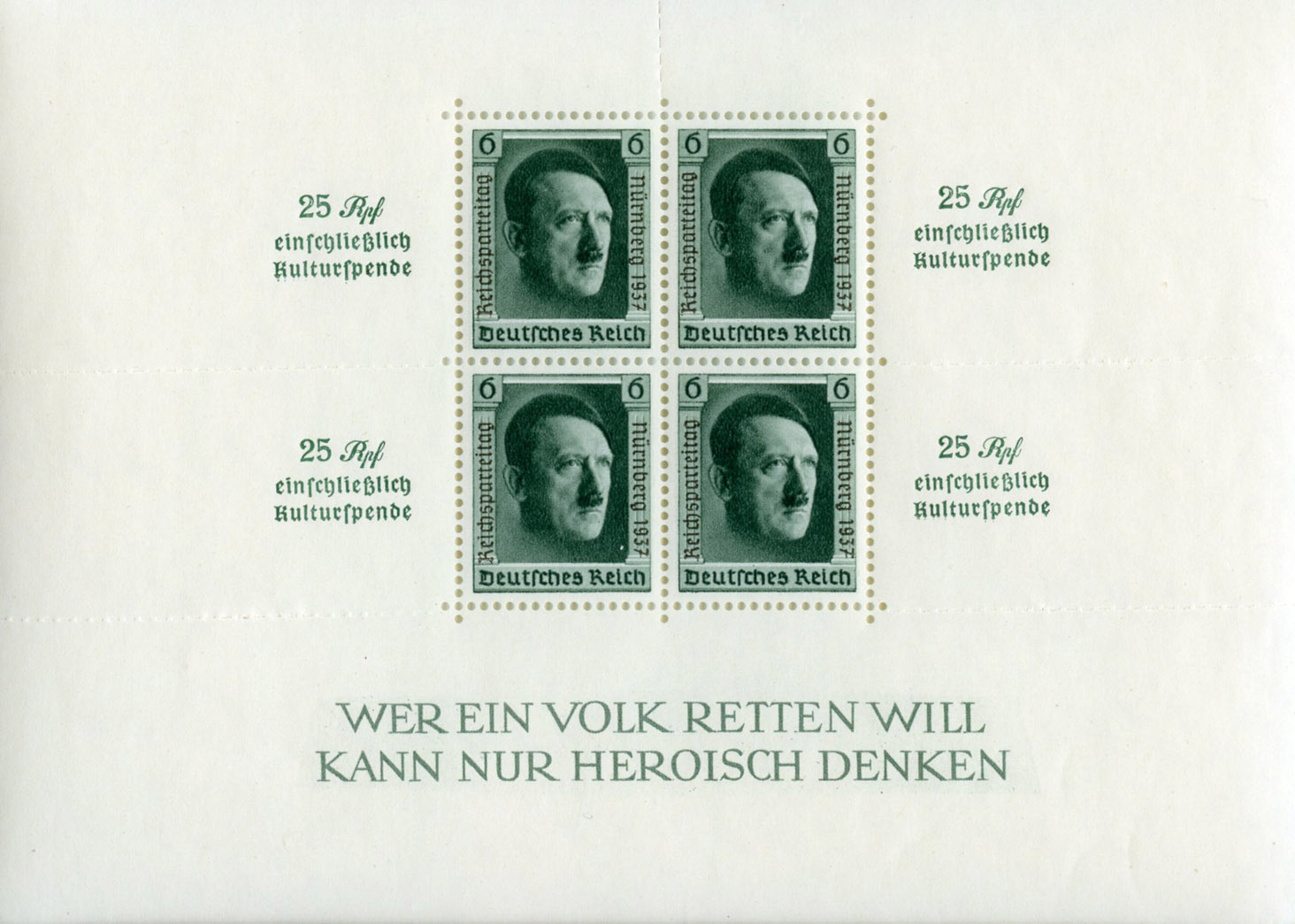 [Below: This was released on September 3, 1937. Note the overprints on the sides of the stamps 'Reichsparteitag Nürnberg 1937'.