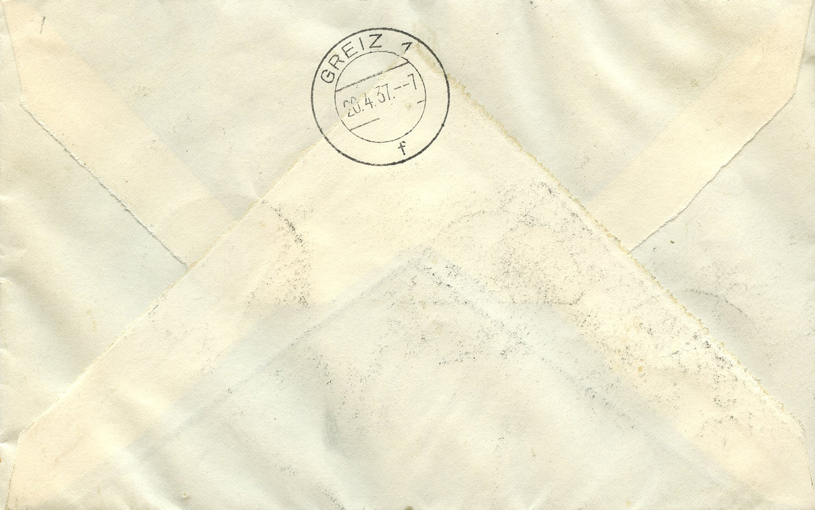 [Below: This envelope, using the imperforate version of the sourvenir sheet, was postmarked in Berlin on April 18, 1937 and sent to Vienna. The cancel is of the type shown earlier.]