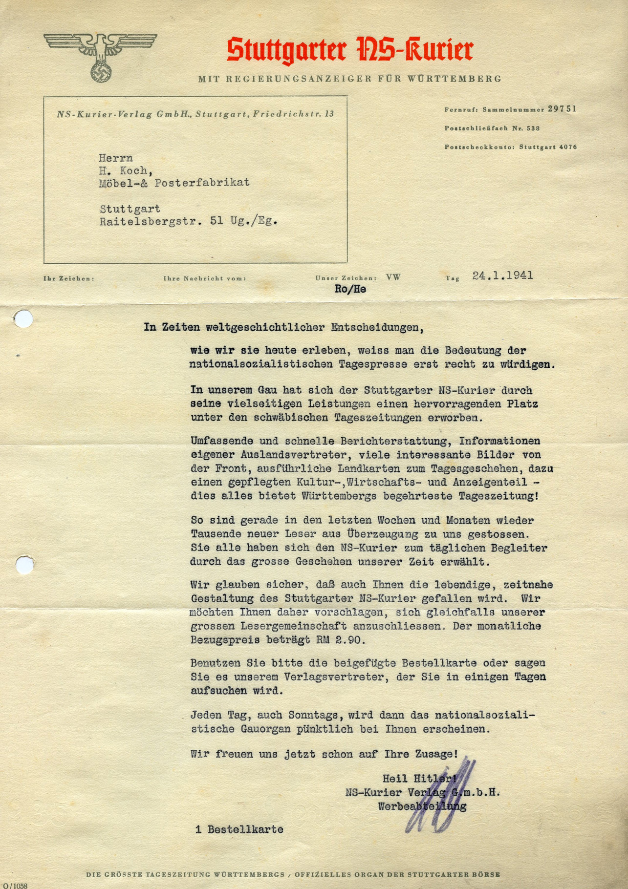 [Below: Here is a document from a National Socialist newspaper called 'Stuttgarter NS-Kurier'. This is dated January 24, 1941, and begins to say: