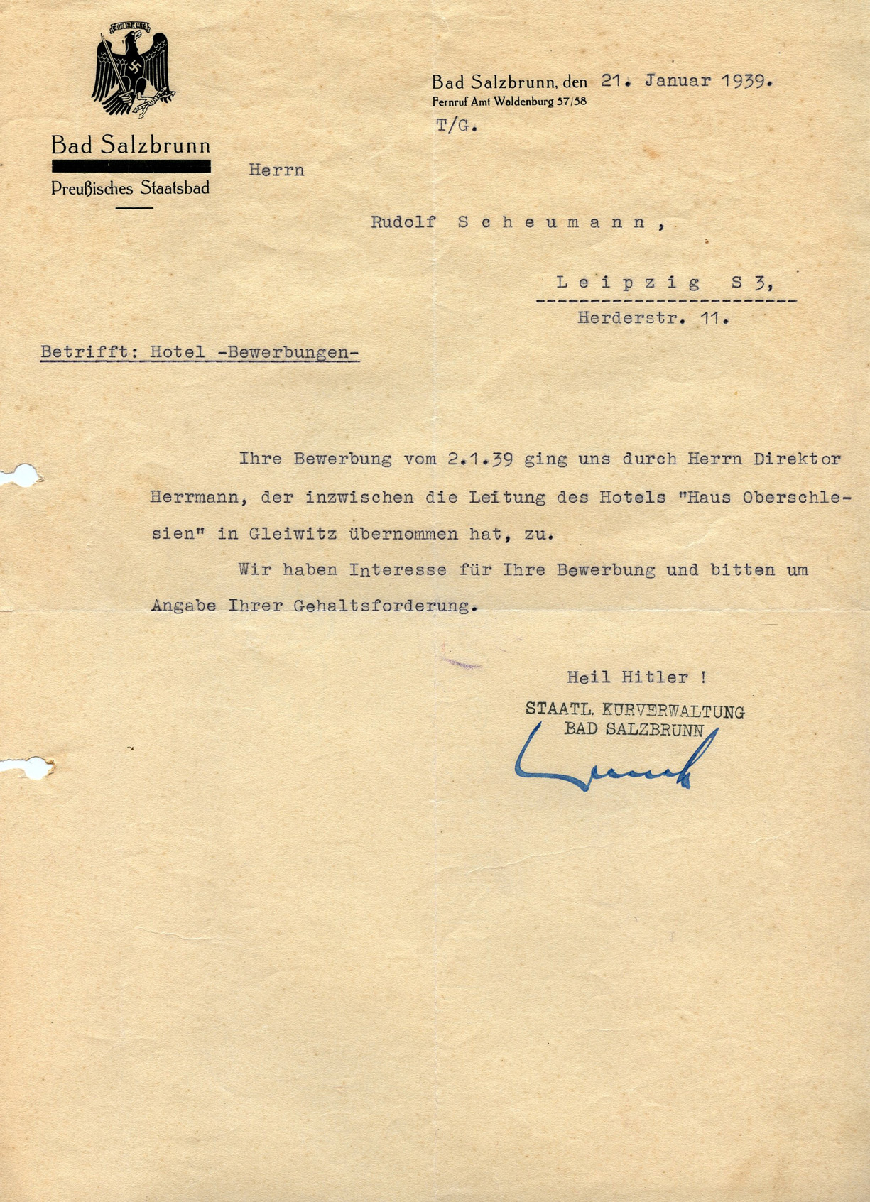 Your application dated January 2, 1939 was sent to us by Director Herrmann, who has now taken over the management of the “Haus Oberschlesien” hotel in Gleiwitz. We are interested in your application and ask you to state your salary requirements.)]