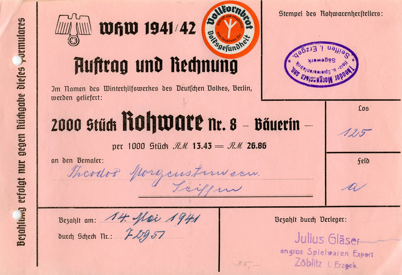 This is an order for 2000 small figures sold to help the WHW. Many such small trickets were sold by the WHW and collecting them became a bit of a craze.]