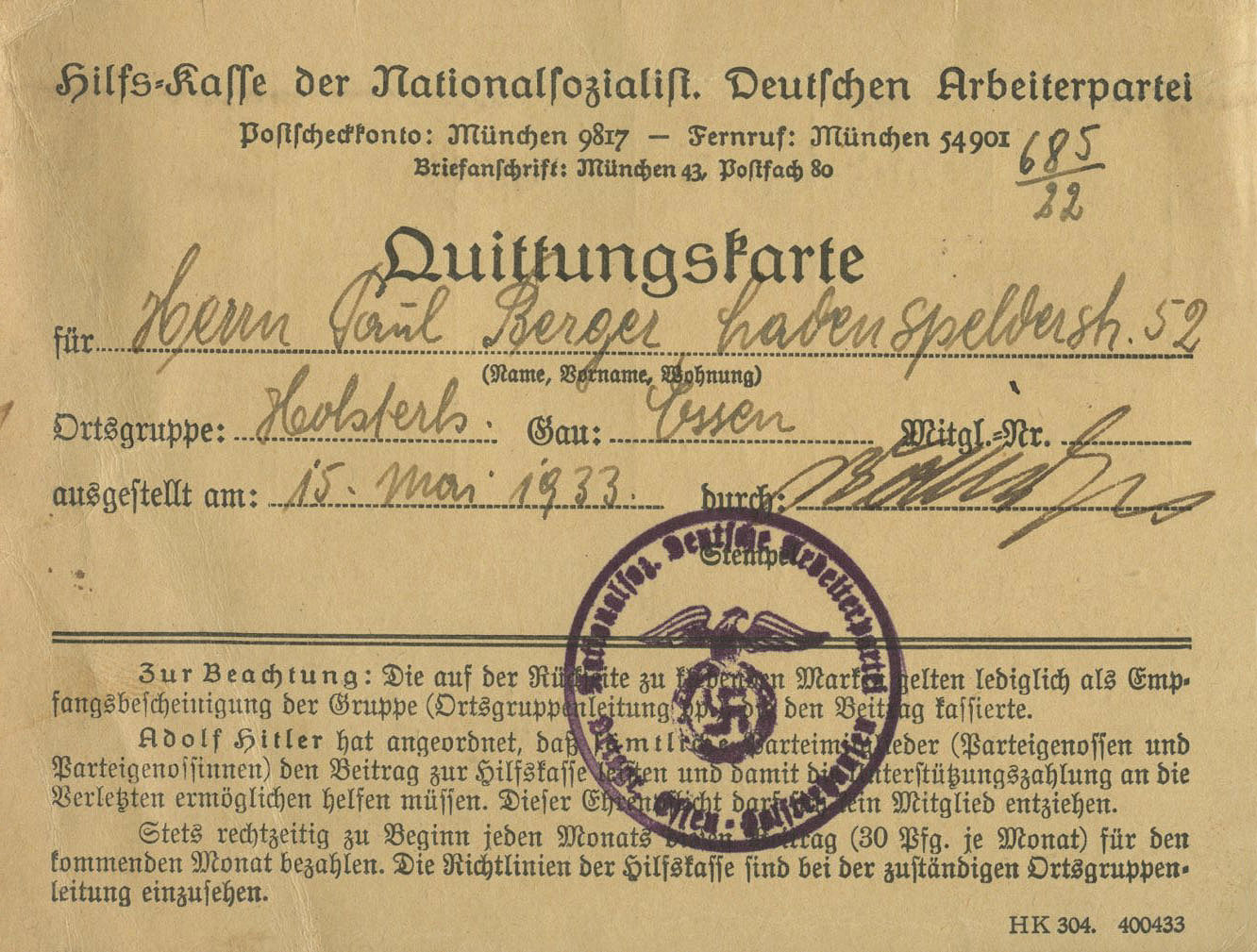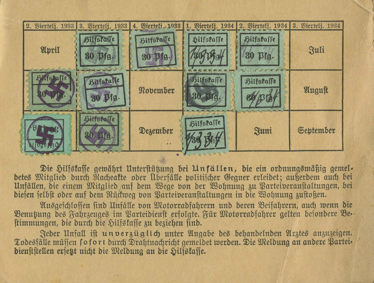 [Below: This card says: 'Hilfs-kasse der Nationalsozialist Deutschen Arbeitpartei Quittungskarte' (Relief Fund of the National Socialist German Workers' Party Receipt Card).]