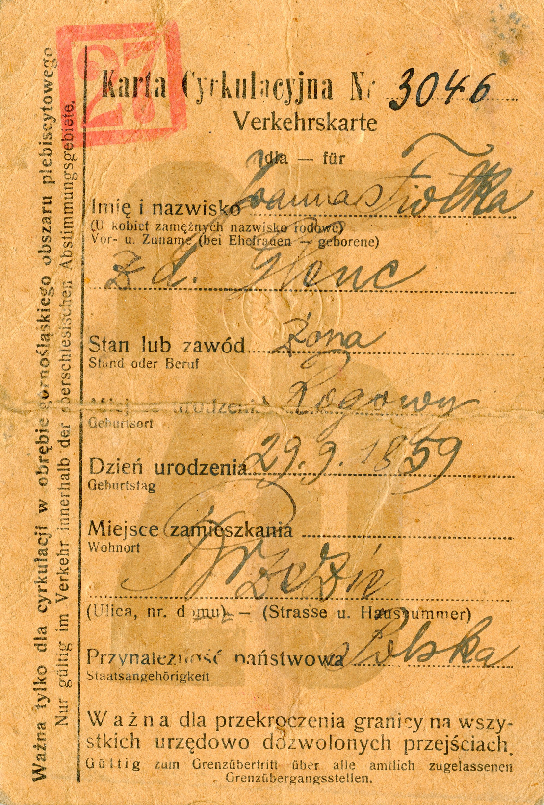 It also lists her birthplace and date, address, proffession and current address. She was 83 years old at the time of this I.D. card.]