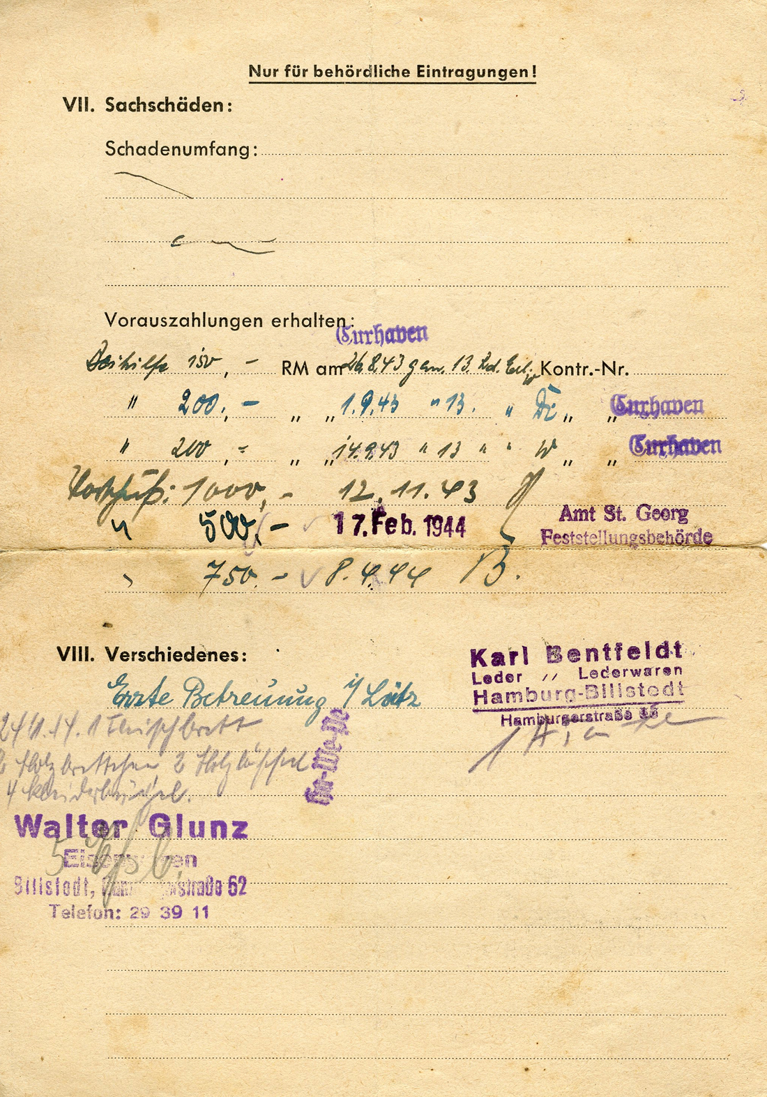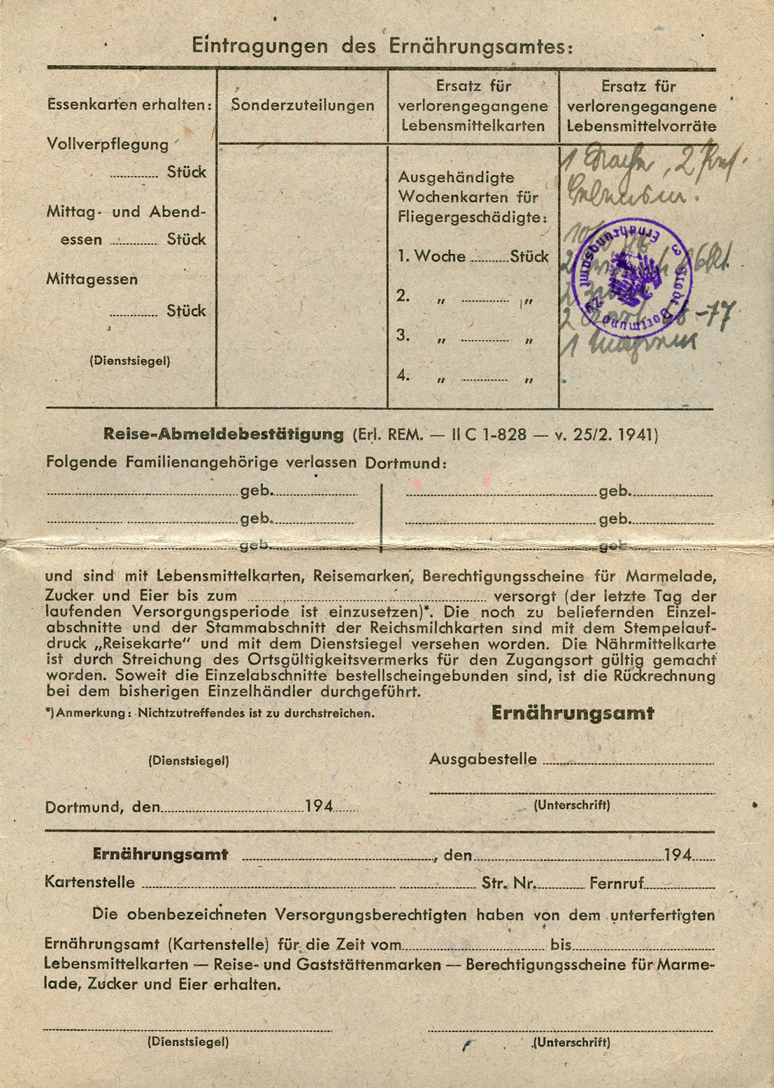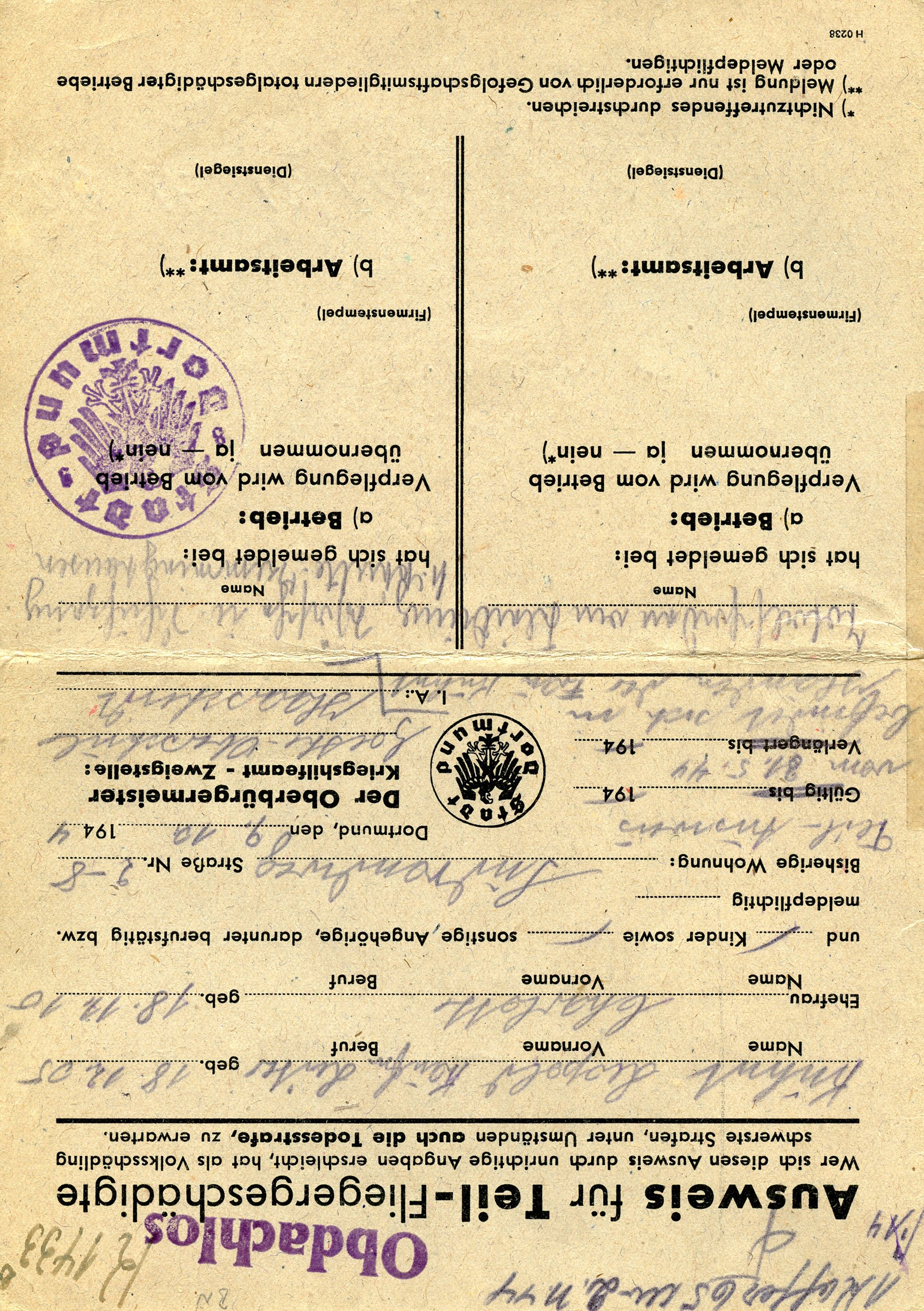 [Below: This is interesting. It is a card for victims of Allied terror bombing on civilians. It enabled the holder to apply for aid from the government. At the top it says: