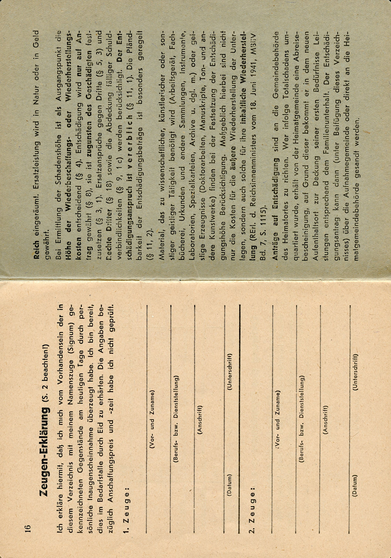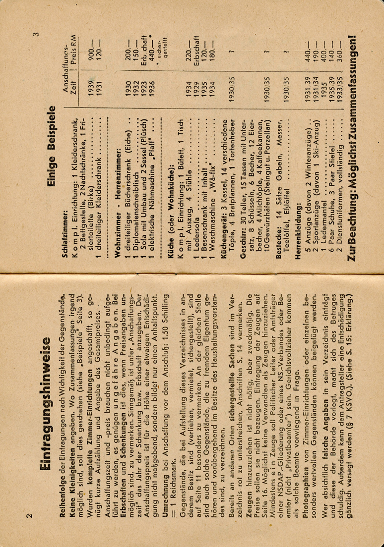 [Below: Page within. This basically says that the government will provide compensation for any of your equipment and home furnishing damged by enemy operations or damaged during defense with its own weapons. It also says 'Currently working for: Wehrmacht']