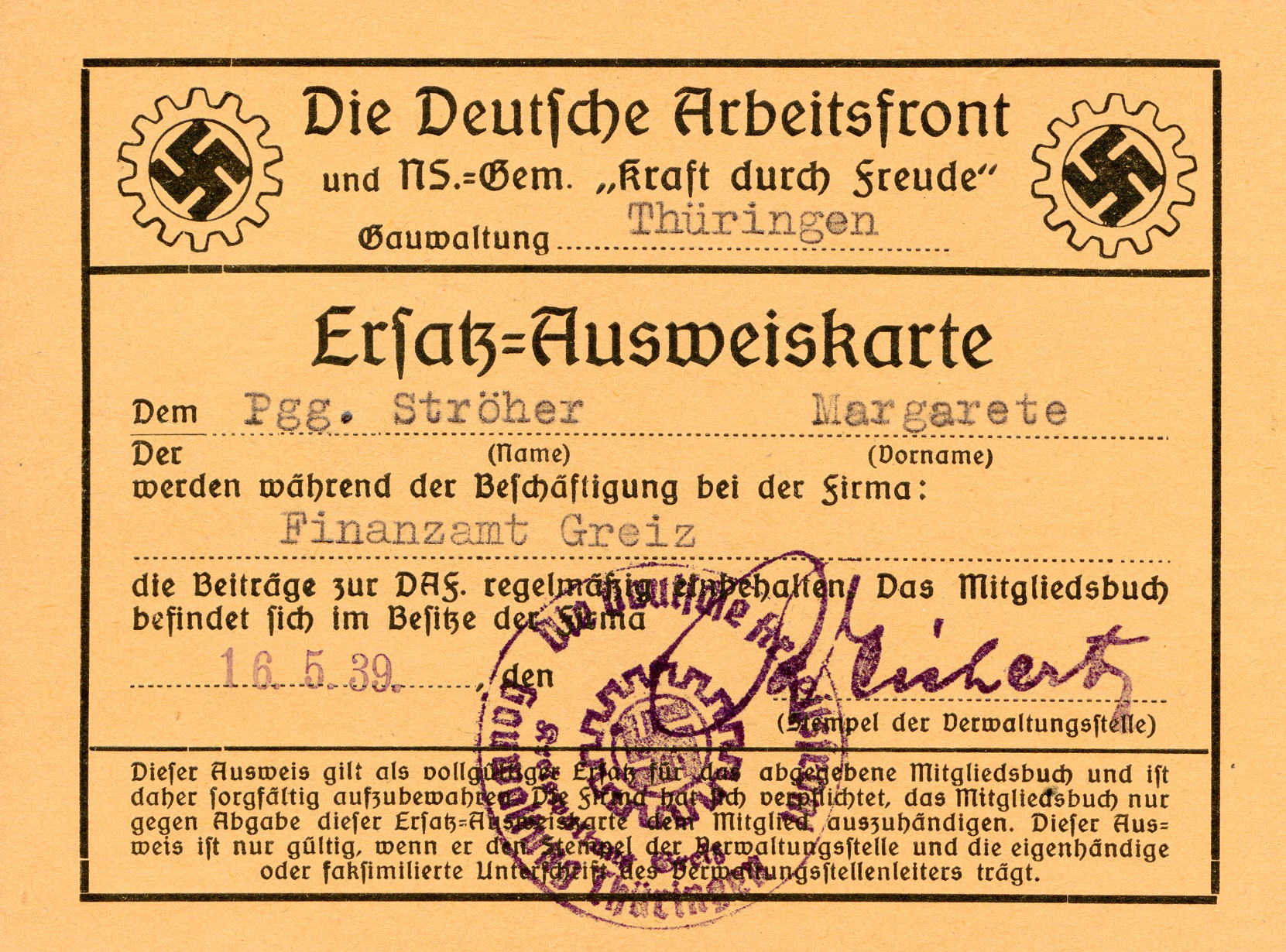 [Below: This is a DAF replacement ID card. It says: 'Ersatz=Ausweiskarte' (Replacement ID card).]