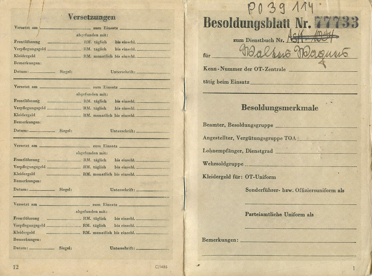 [Below: This is a Todt Organization payment book that accompanied the indentification/service book. I've translated some of the titles seen here: