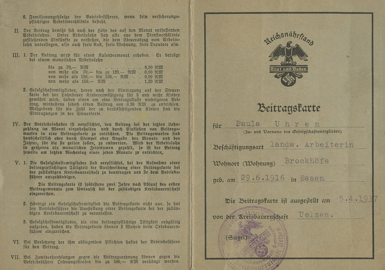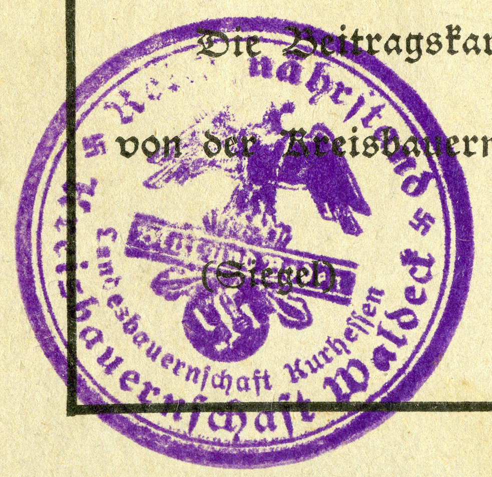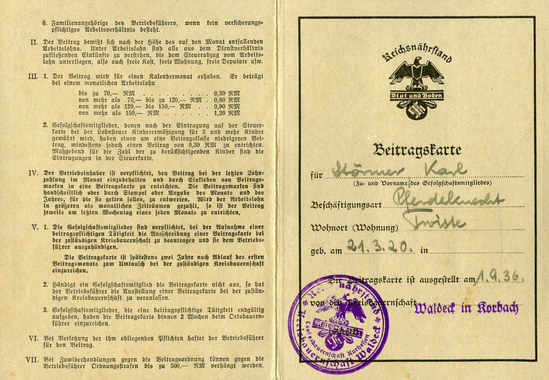 [Below: And Reichsnährstand booklet. This one uses a fancy typewriter font to type in some information, like expiration date and membership fee.]