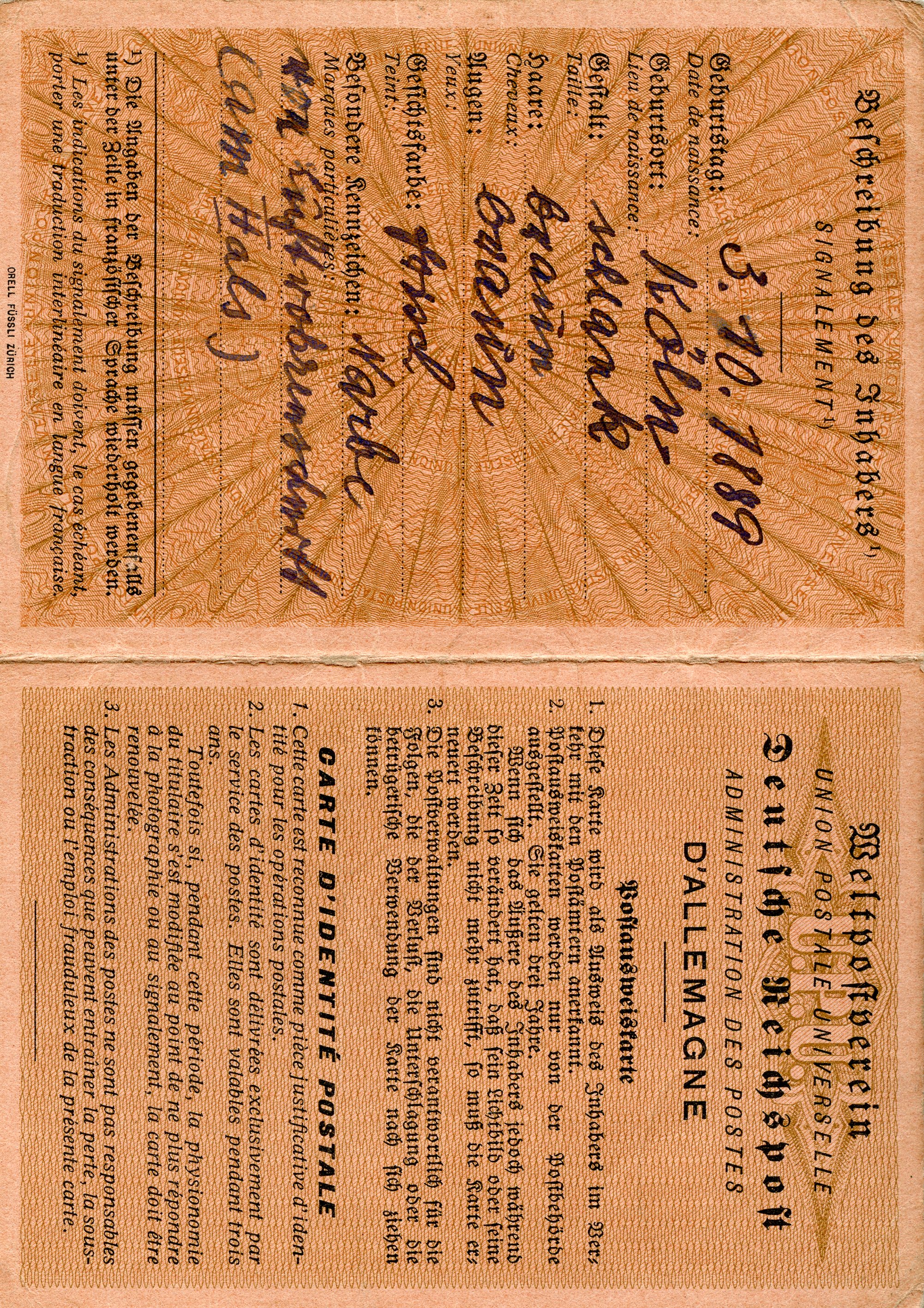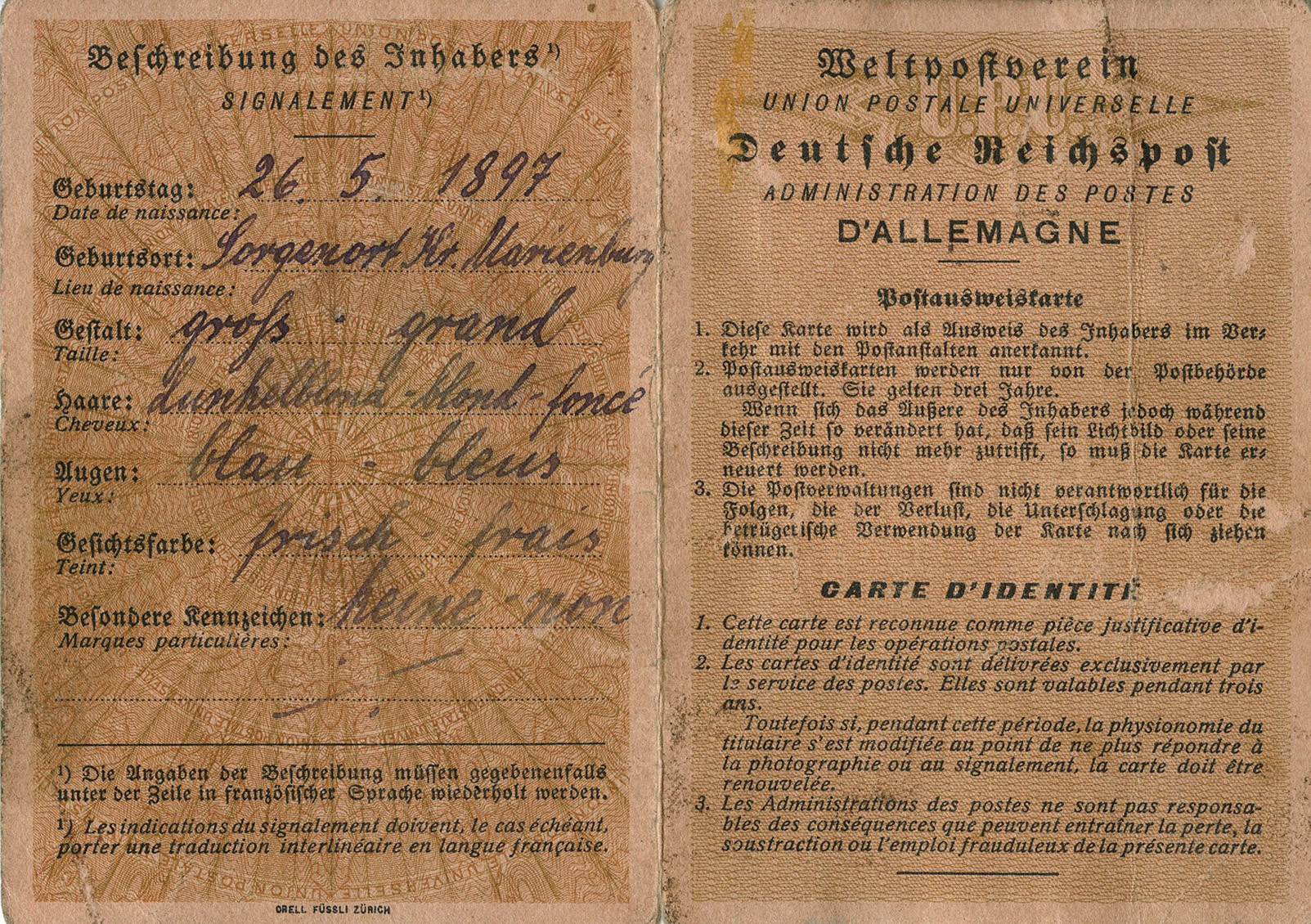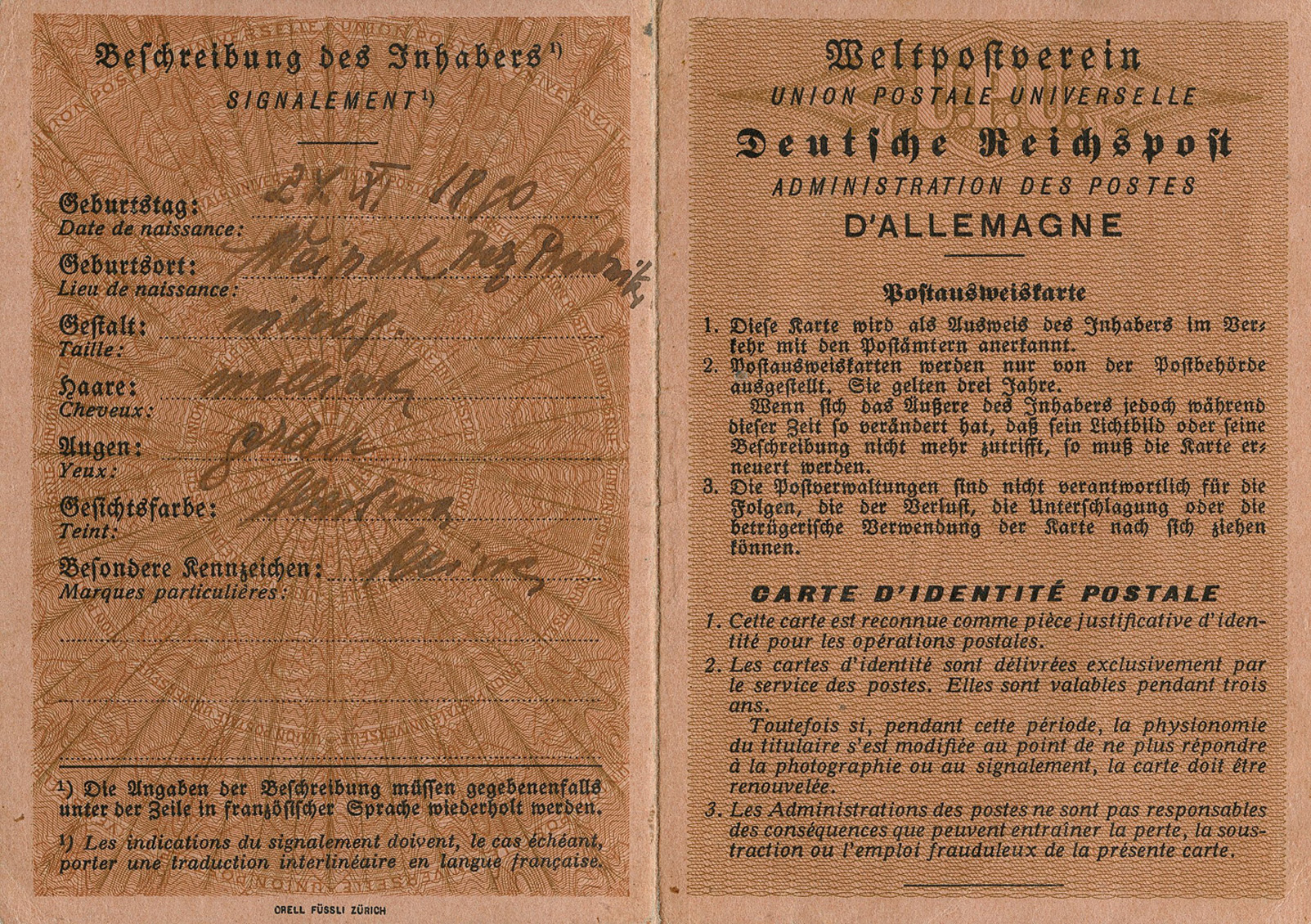 [Below: Here are four postal worker identity cards. These are pretty rare, just look at the insanely low numbers of the book. The first is #579, the second is 340, the third is 236 and the last one is 1487. They are in German and French. It says: