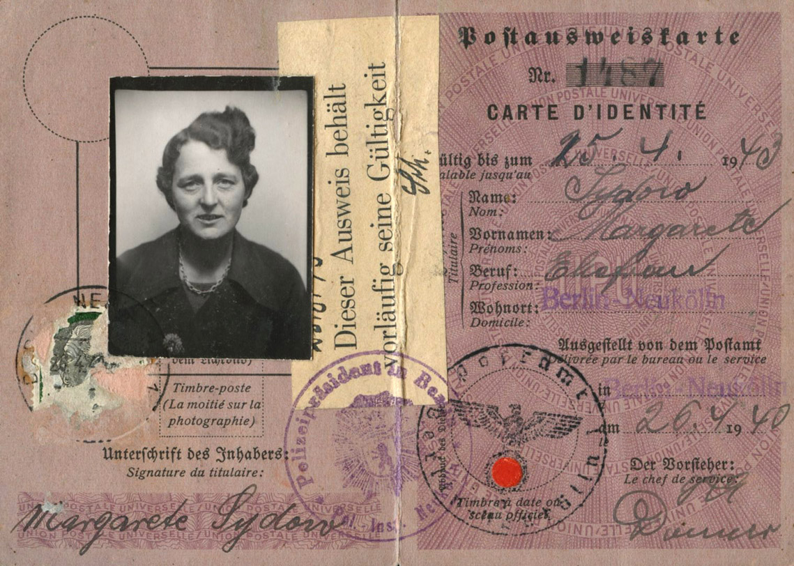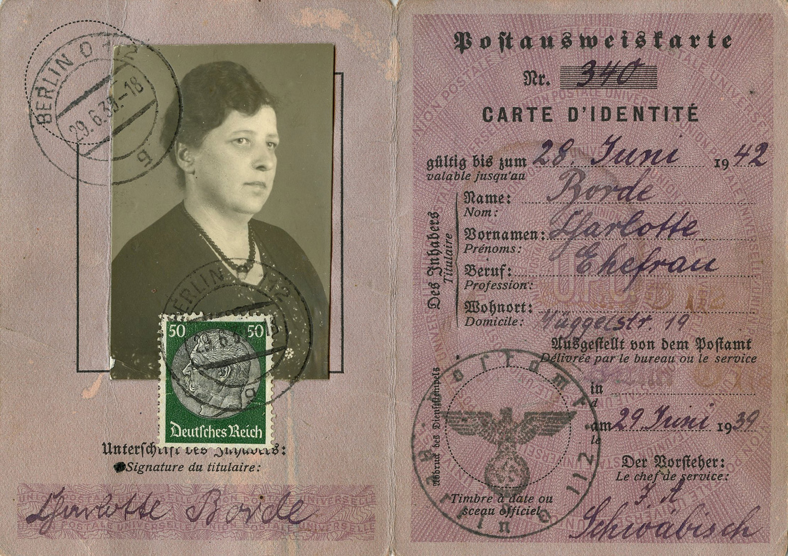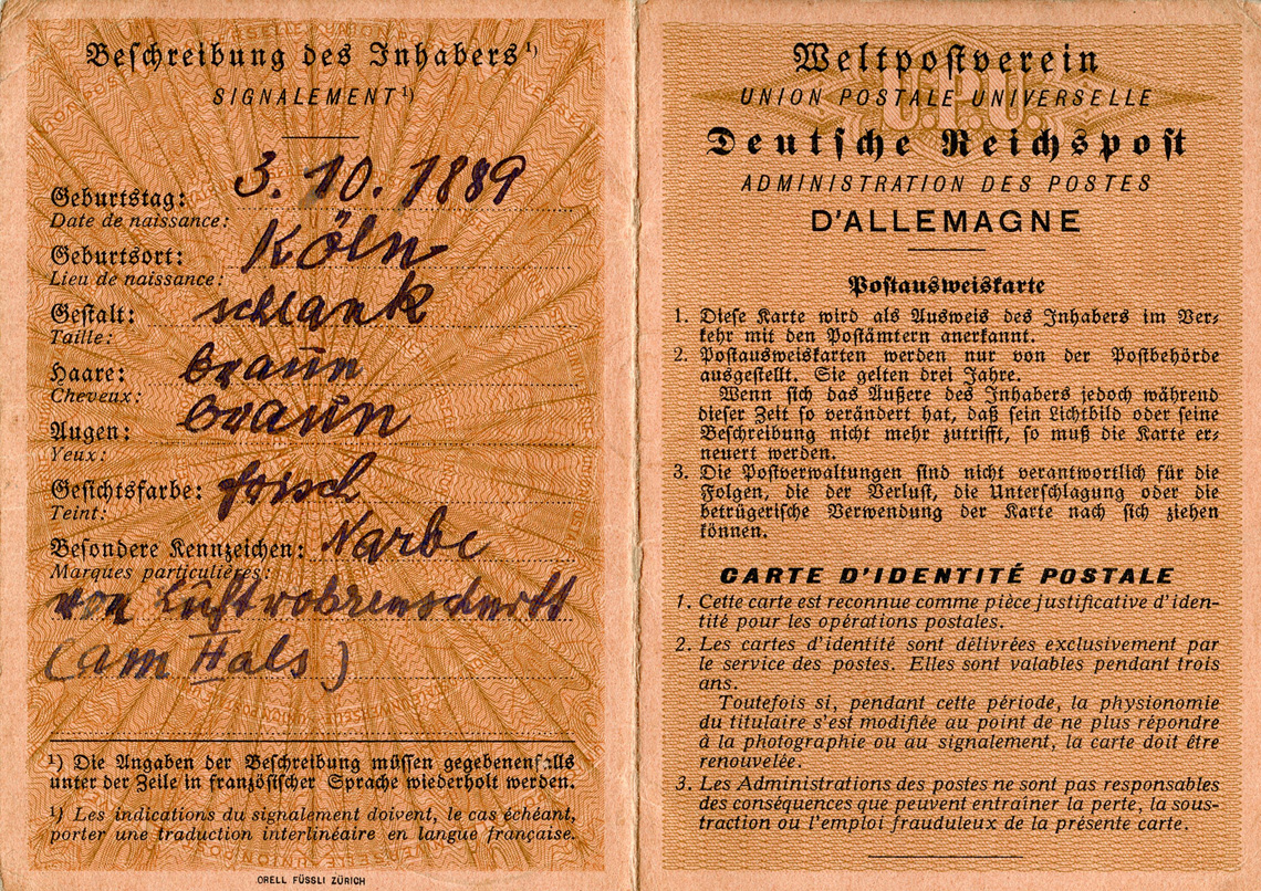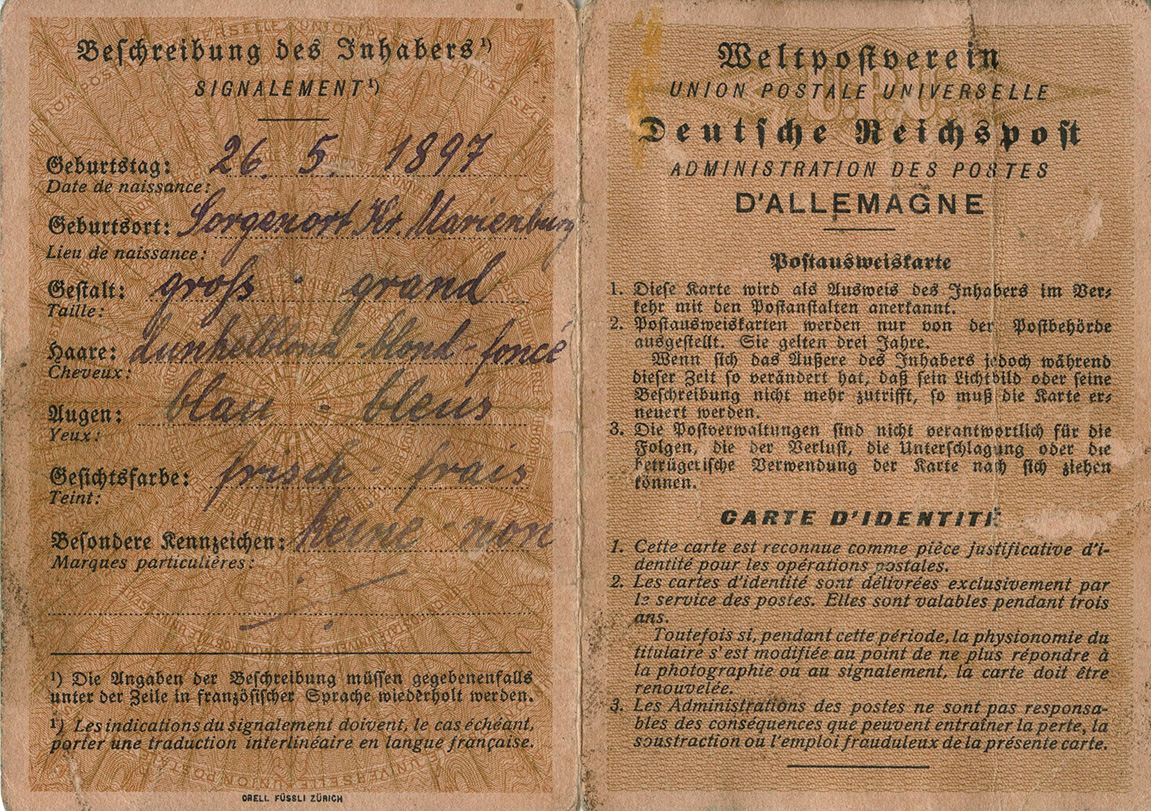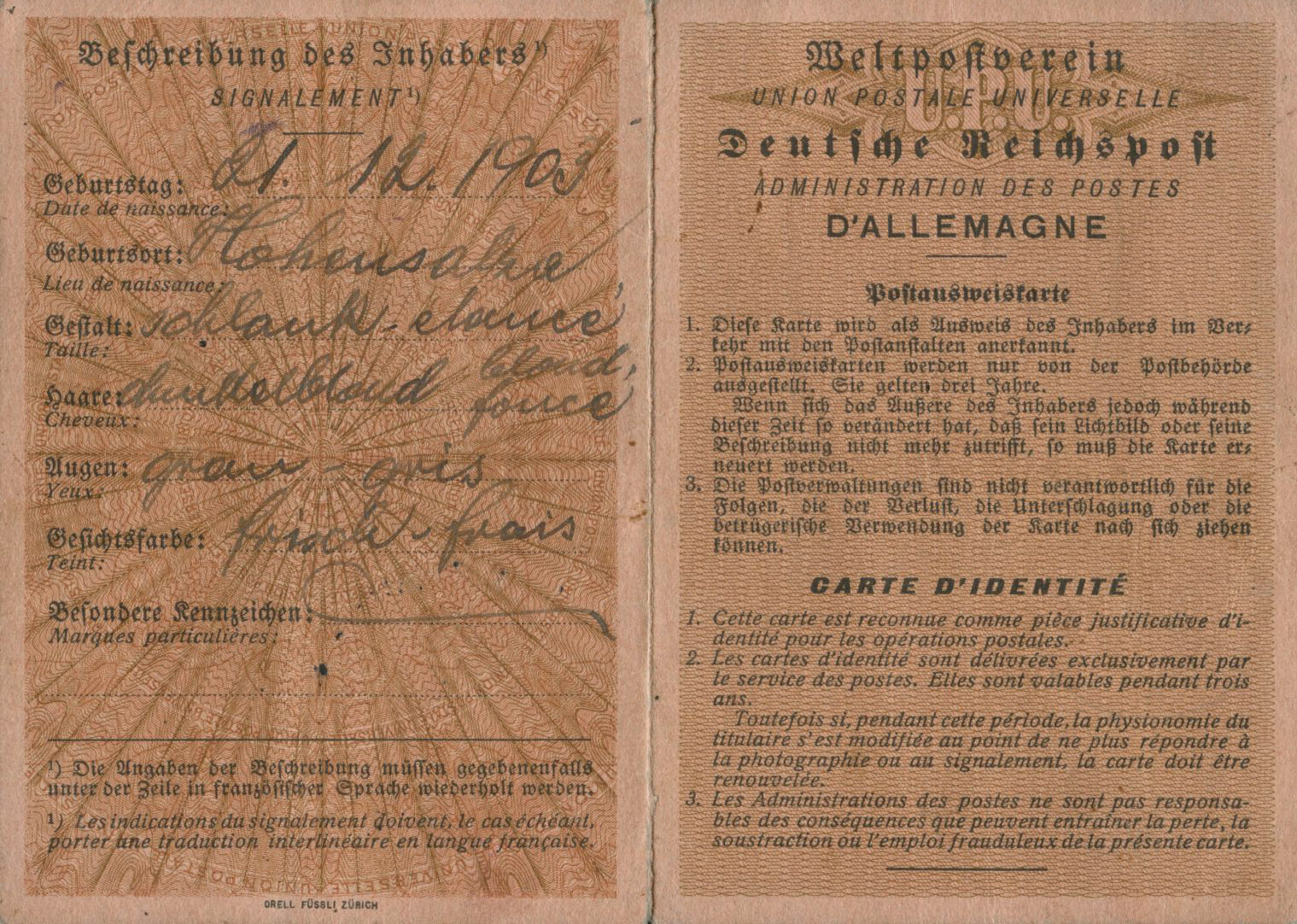 [Below: Another postal worker identity card. Note that this one uses a Hindenberg postage stamp instead of the Adolf Hitler variety used above.]