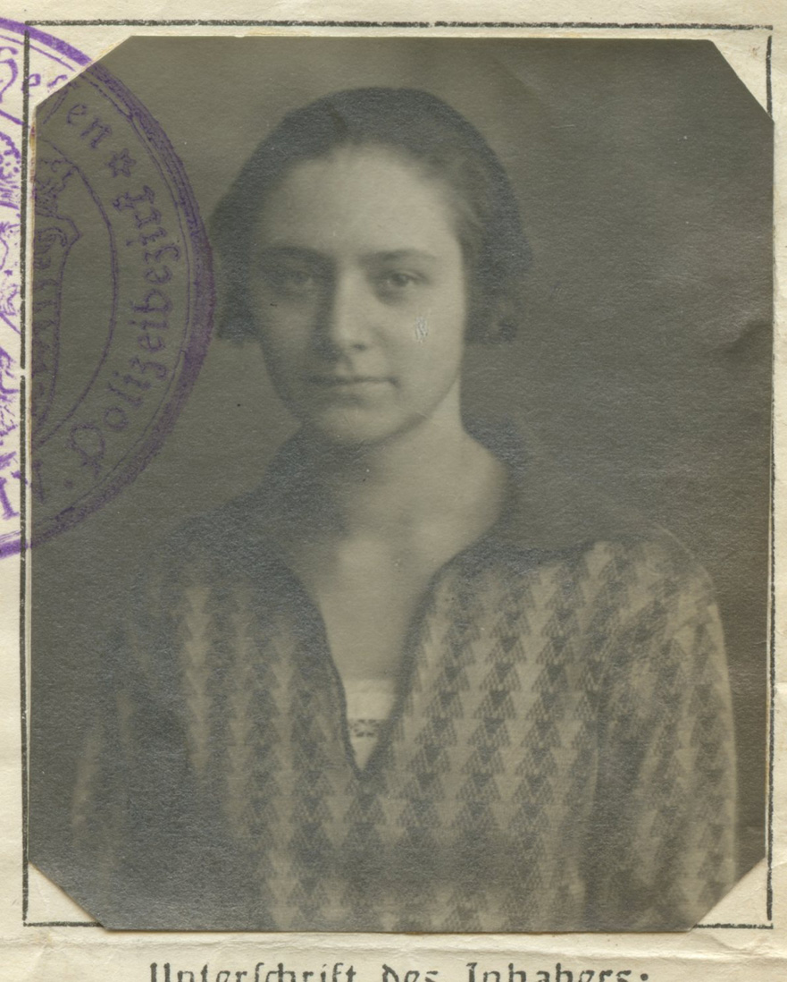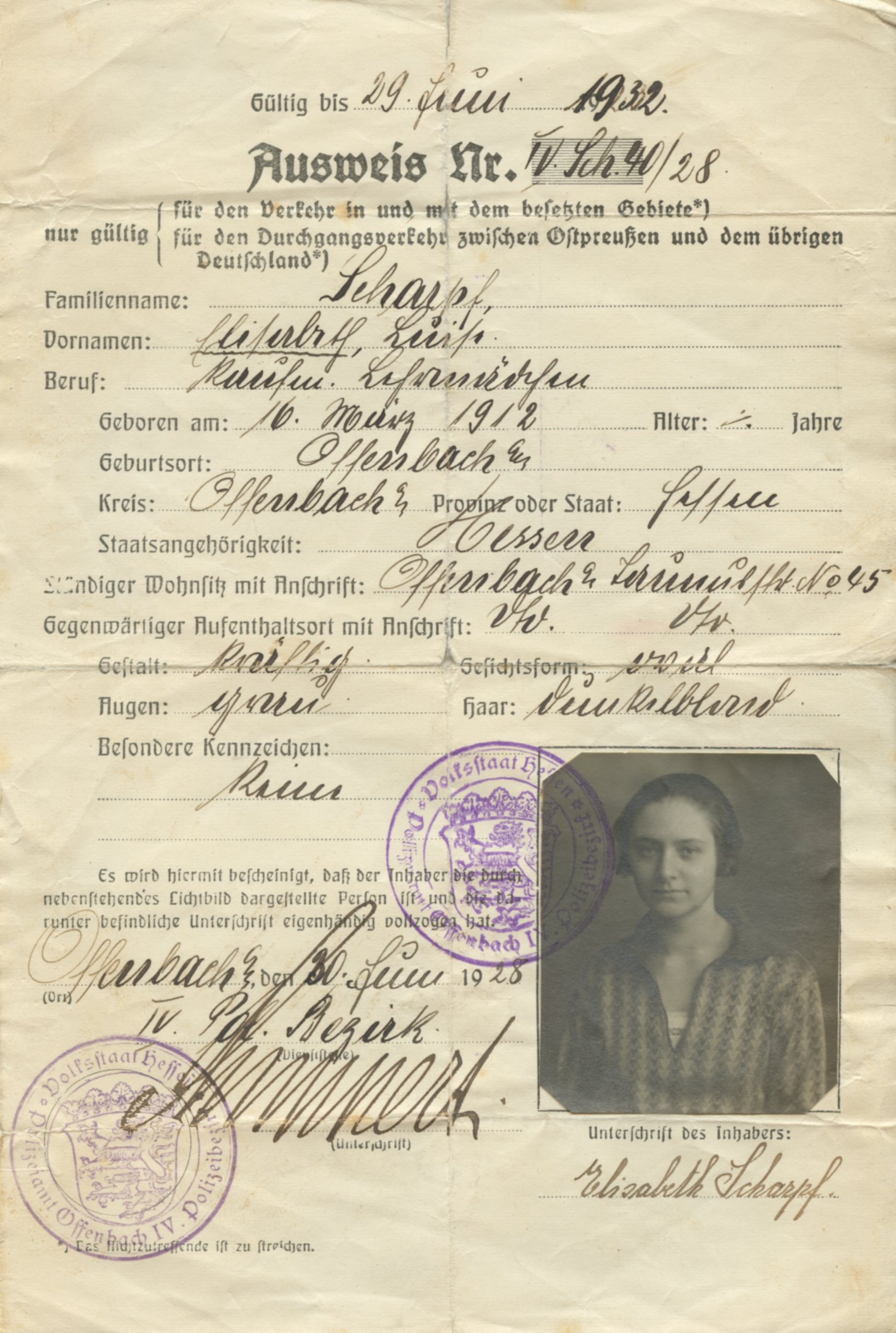 [Below: 1932 identity paper for Elisabeth Scharpf, born March 16, 1912. She was 20 years old at the time of this photo. She had green eyes and dark blonde. She was born in Offenbach, a city in Hesse, Germany, on the left bank of the river Main.]