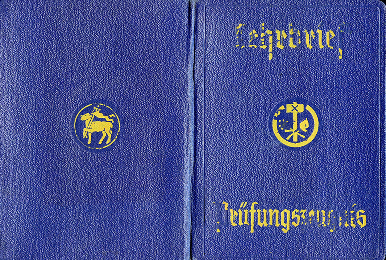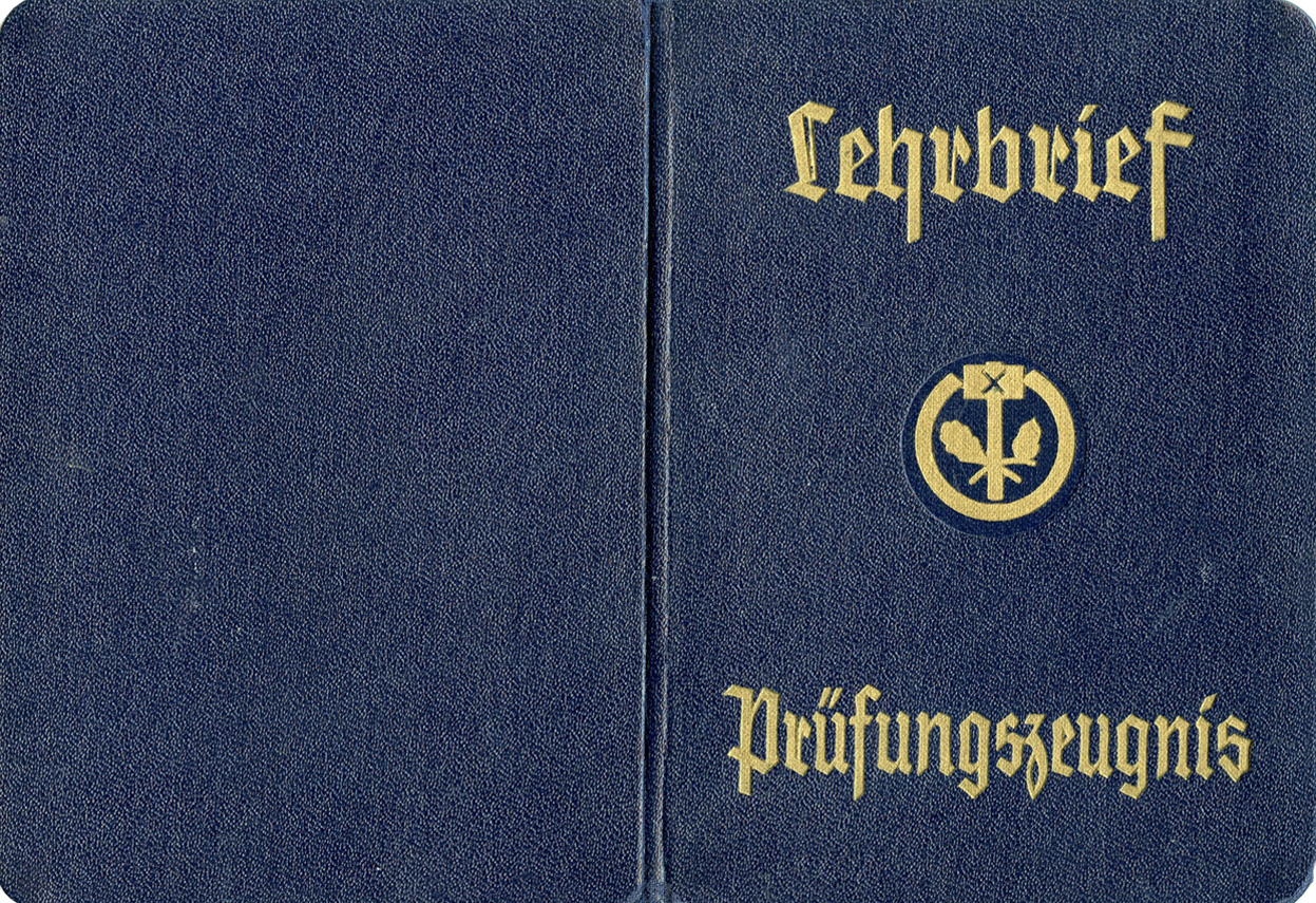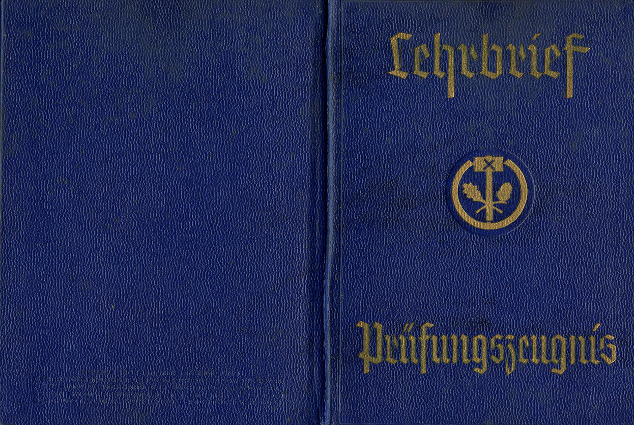[Below: Here is a booklet not came across too often, so it is fairly uncommon. This shows the back/cover of an 'Lehrbrief' (Teaching certificate) and also says 'Prüfungszeugnis' (Examination certificate). This membership book was issued on August 7, 1939 to Paul Becker, who was 19 years old at the time and living in Bergheim (a town west of Cologne). This booklet is to certify that he has 'das maler handwerk erlernt' (learned the painter's craft). Click on image to see inside!]