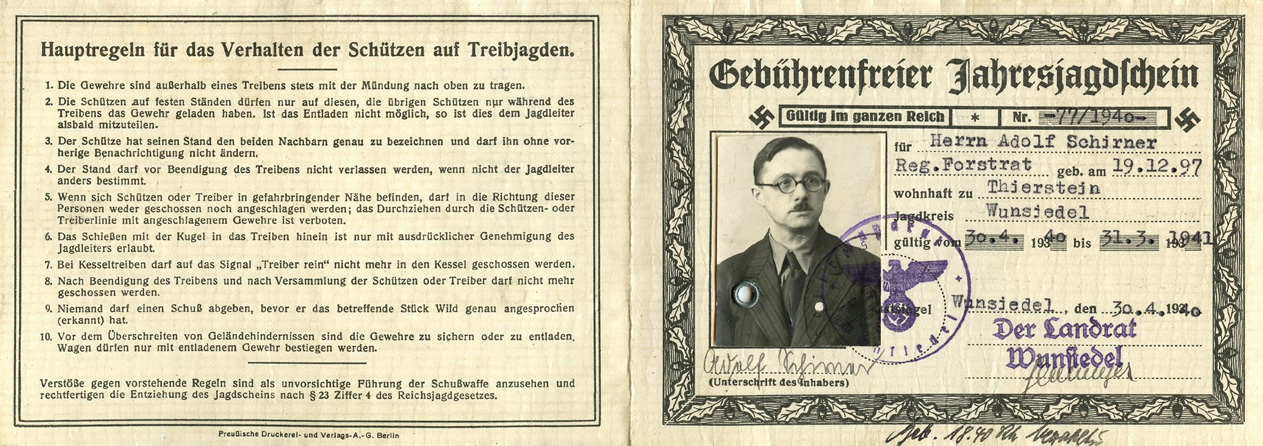 This permit was issued to Adolf Schirner, who was born December 19, 1897, on March 31, 1941. He lived in a town called Thierstein, Bavaria (a municipality in the district of Wunsiedel). Thierstein is a beautiful little place... Click on image to see inside!]