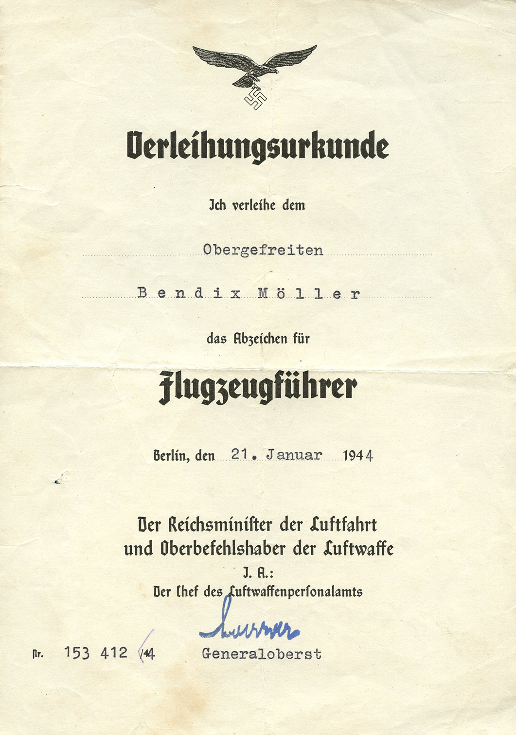 [Below: Here is an award document earned by Obergefreiter Bendix Möller. It says: