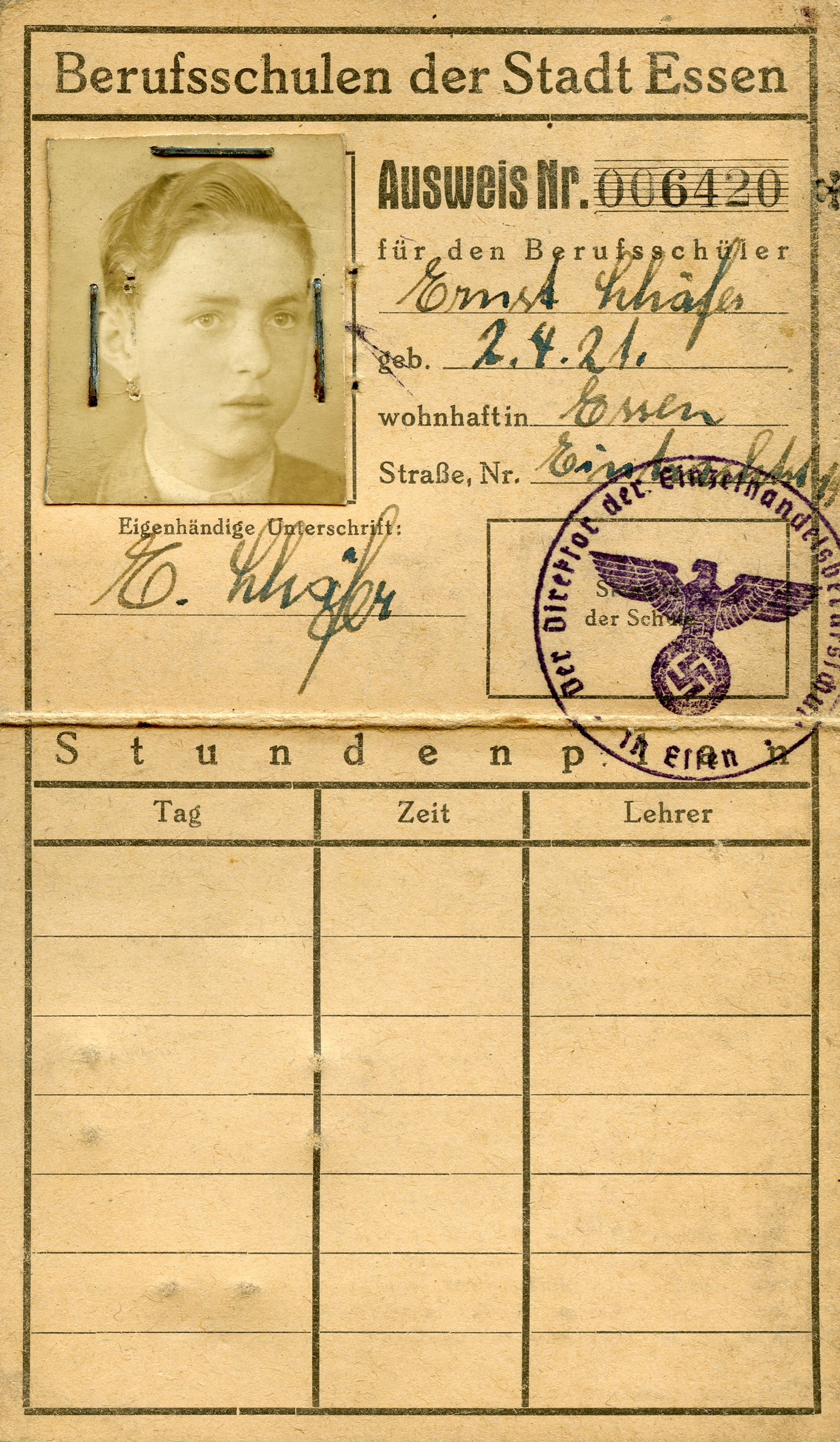 [Below: What a handsome lad. This says: 'Berufsschulen der Stadt Essen' (Vocational schools in the city of Essen).]
