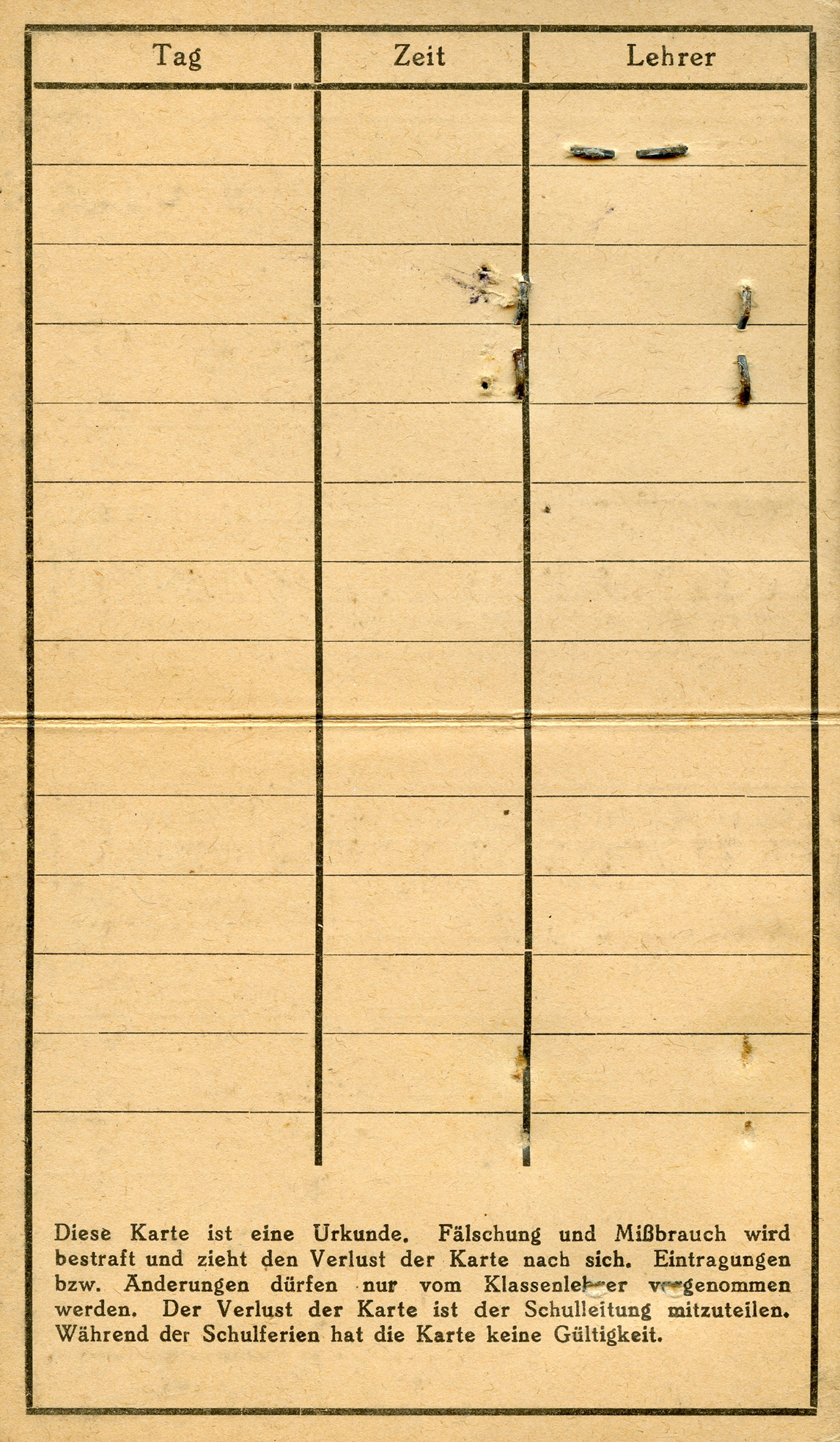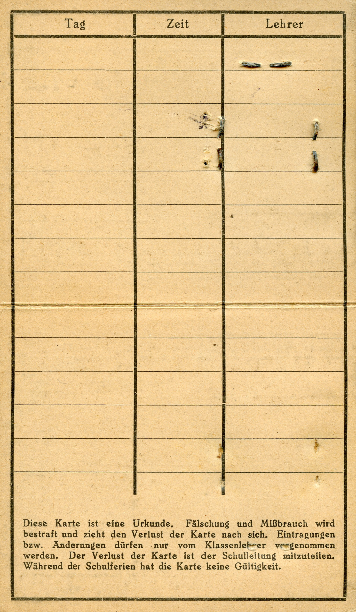 'This card is a document. Forgery and misuse will be punishedm and will result in the loss of the card. Entries or changes may only be made by the class teacher. The loss of the card must be reported to the school administration. The card is not valid during school holidays.']