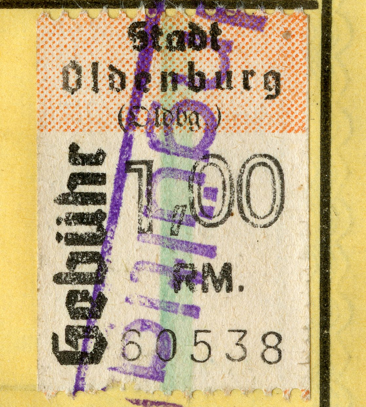 [Below: Here we see this was issued on July 17, 1945 in Oldenburg. It has a strange-looking tax stamp, I think this is a Third Reich issue that they were able to keep after the occupation because it didn't have swastikas on it.]
