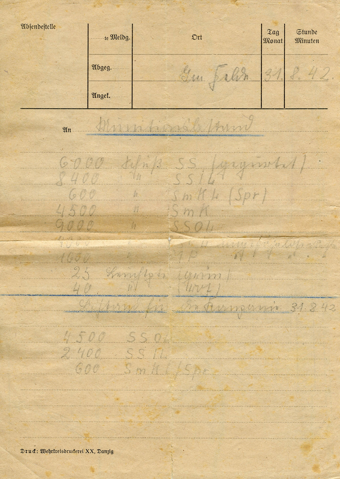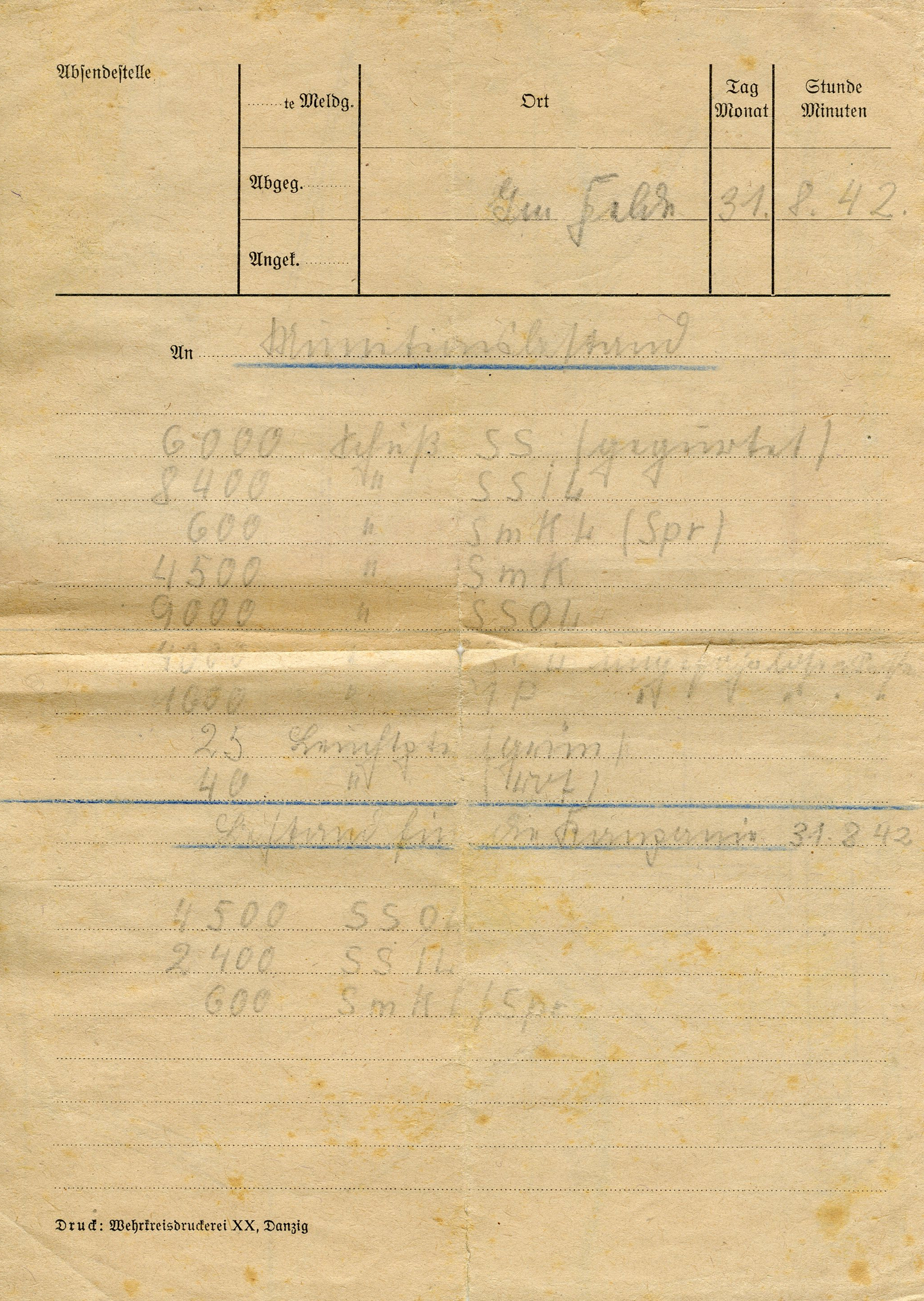 [Below: Now here is a mystery... I got this in a stack of various WWII military papers and identification cards. But what is it? Most of it is written in Sütterlin Script 'absendestelle' means something like 'sending place' and it also has places for dates and times. On the bottom it says 'Druck: Wehrkreisdruckerei XX, Danzig' (Print: Military District Printing House 20, Danzig). On the back is a hand-drawn map.]