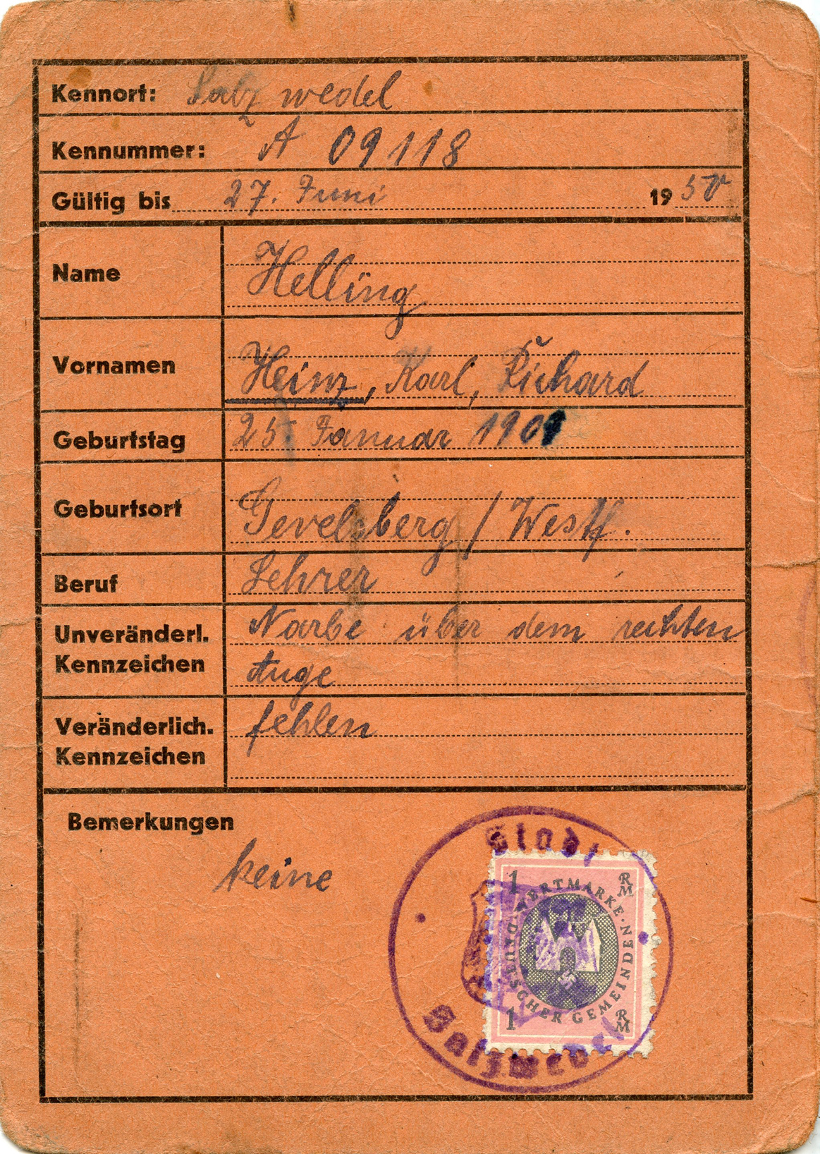 [Below: This is strange that it is orange color and has no picture or issue date, or even an eagle and swastika, not to mention it uses a stamp I've never seen used for an identification book. This was good until 1950.]