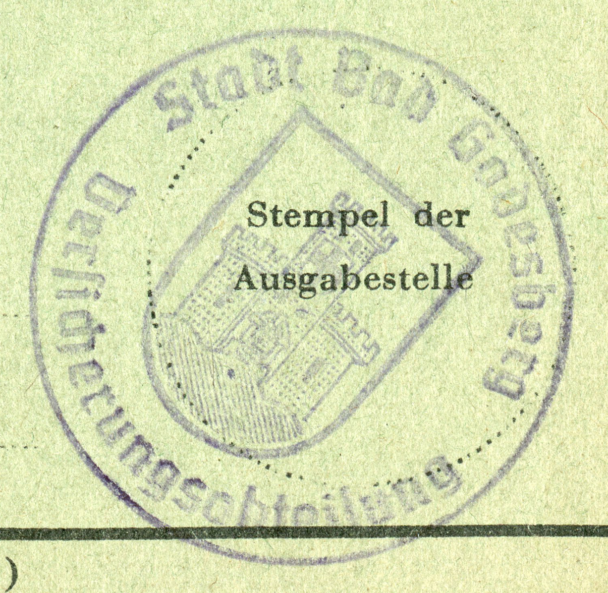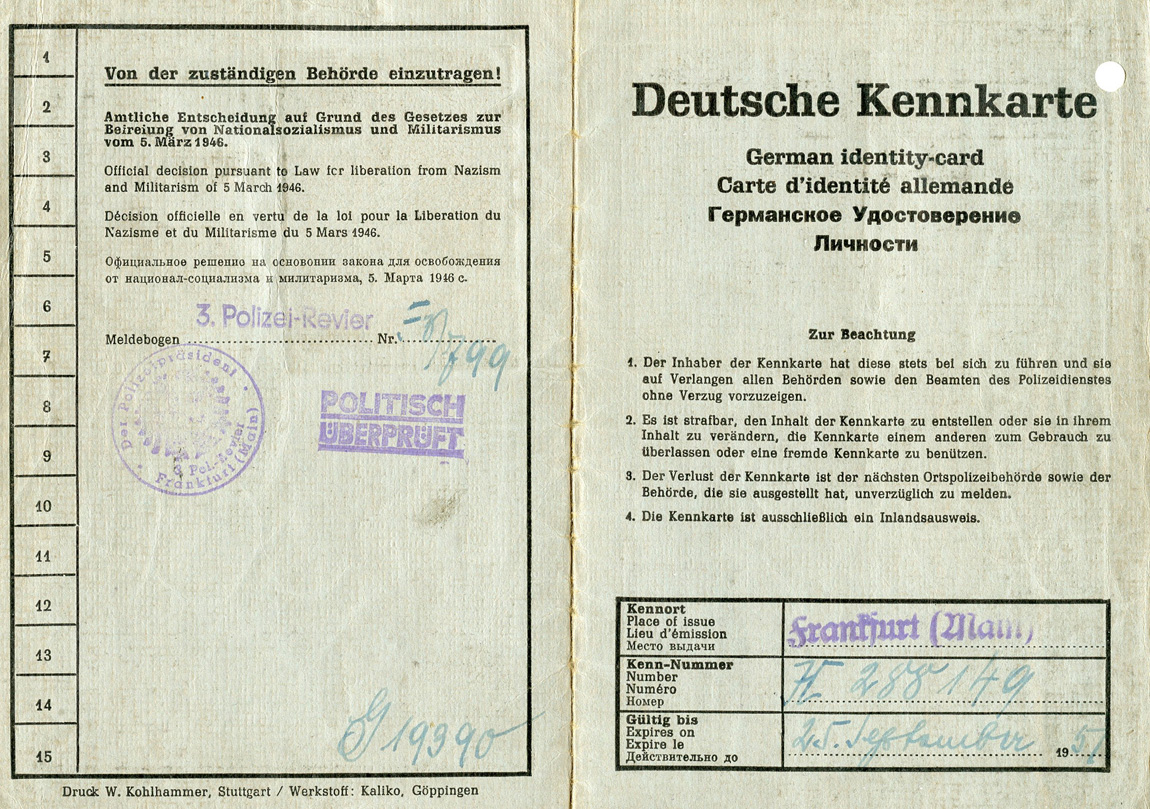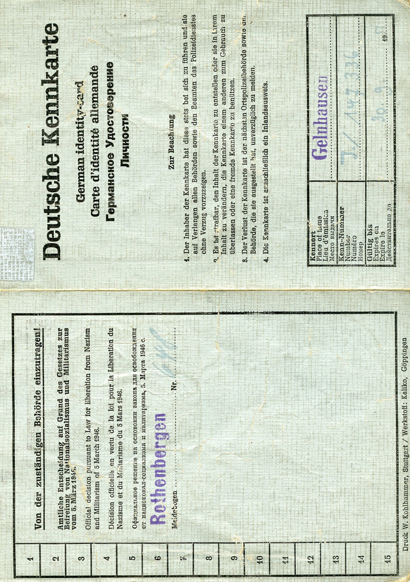 [Below: Another Kennkarte, this time from the Allied occupation. This is made of thin paper. What is that design in the middle?]