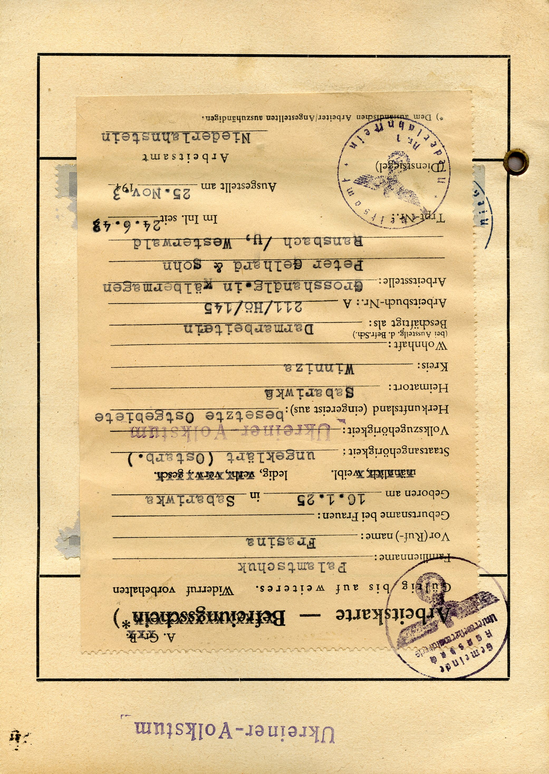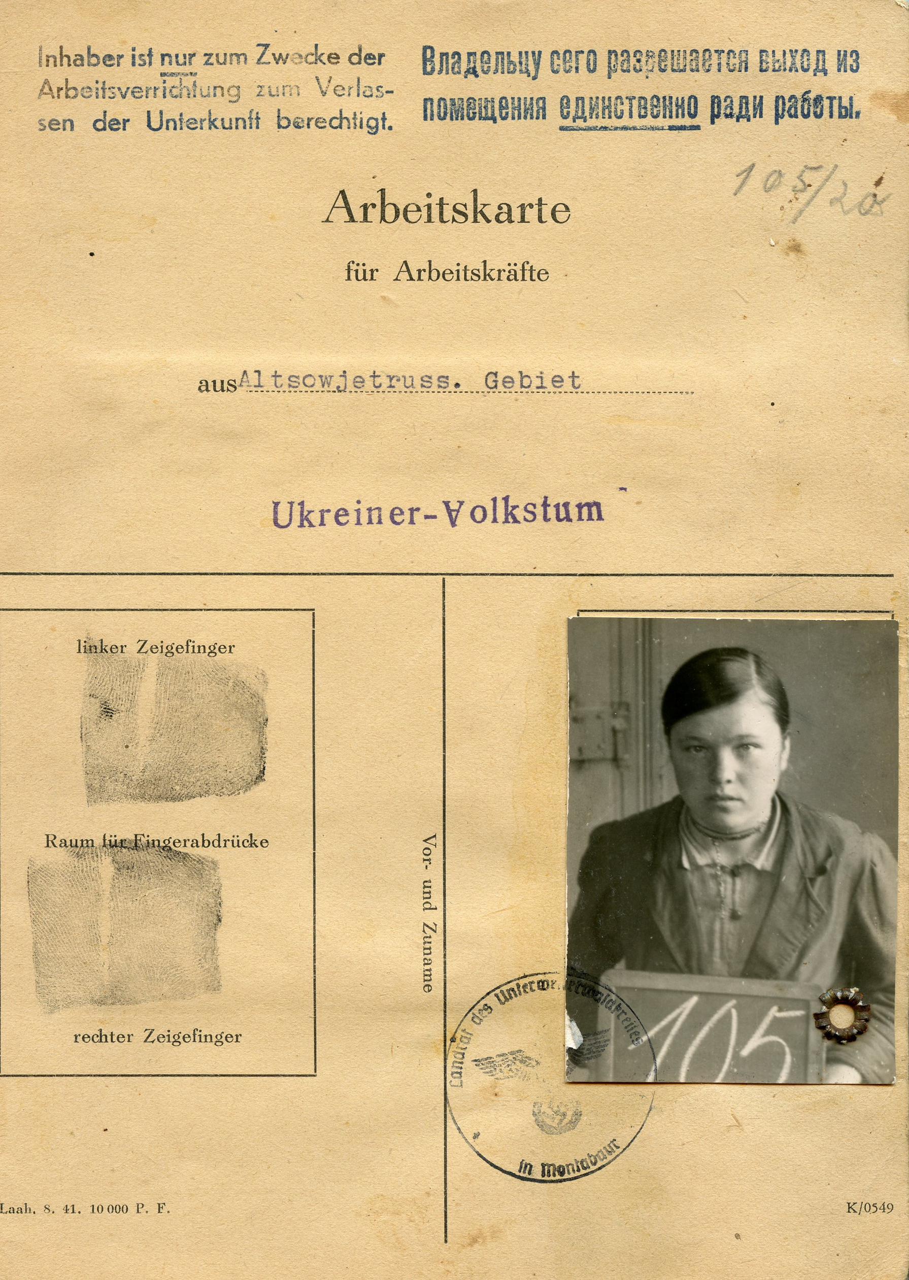 [Below: This is a rare, unusually large work permit (in German and Cyrillic) for a Ukrainian girl named Frasina Palamtschuk. She was born on January 16, 1925 (she was 17 at the time) in Sabariwka (Zabarivka), a village in Ukraine. At the top it says: 'The owner is only authorized to leave the accomodation for the purpose of performing work.' In the center it says 'Work card for workers from Old Soviet Russia'.]
