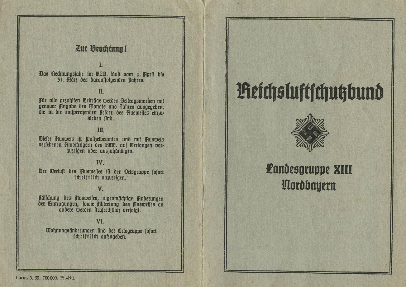 [Below: Another membership card from the 'Reichsluftschutzbund' (Reichs Air Protection Organization. This one is also from 'Nordbayern' (North Bavaria). Front.]