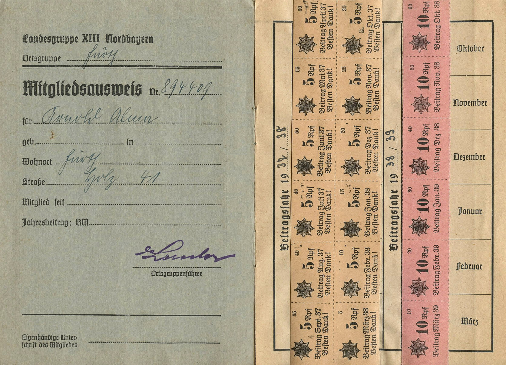 [Below: This looks like it went through a war! Oh that's right, it did! This says 'Nationalsoz. Deutsche Arbeiterpartei Ortsgruppe' (National Soc. German Workers' Party Local Branch) and 'Angang zur Mitliedskarte' (Attachment to Membership Card). Front.]
