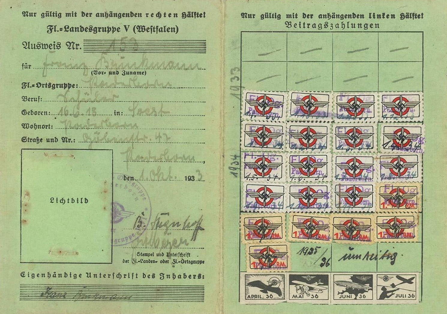[Below: This is a 'Werkstattleiter Ausweis' (workshop manager ID card) from the Deutscher Luftsportverband, or DLV, (The German Air Sports Association) This was an organization founded in March 1933 for the training of military pilots. Front/back.]