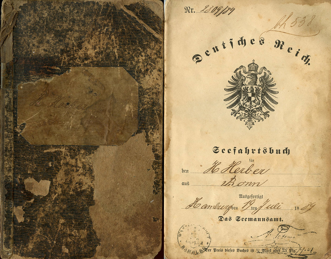 [Below: Wow, this is neat, and quite old. It's a navy man's log book, detailing everywhere he sailed to and what captain and ship he was on. It was issued in 1889, the year Adolf Hitler was born, to H. Herber. He visited such far away places like Brazil, Nova Scotia, England, the USA (Boston & New York) and Portugal. Click to see inside!]