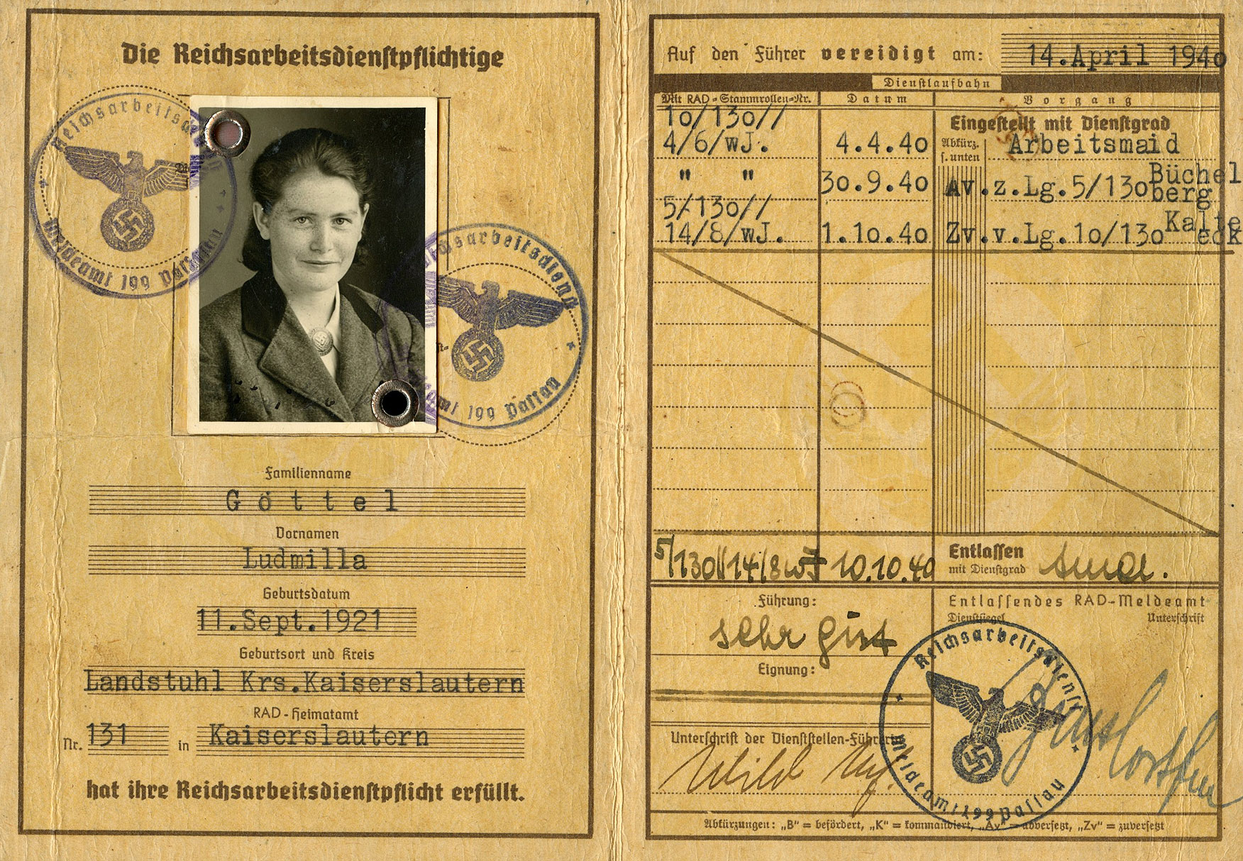 [Below: Inside. Meet Ludmilla Göttel, who was 19 years old when this book was issued. She is from Landstuhl Kaiserslautern (Landstuhl is a town in the Kaiserslautern district of Rhineland-Palatinate in Germany). She worked in Büchelberg (a municipality in the district of Passau in Bavaria), which is a little over 60 miles from her home. She also worked in Kalteck (Lower Bavaria).]