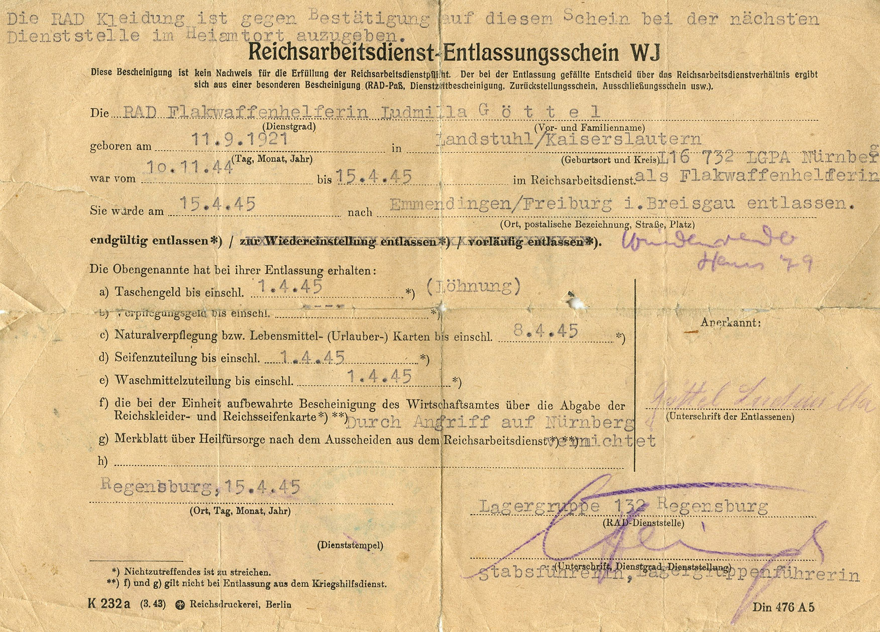 She saw the war until the bitter end. On April 15, 1945 she was discharged in Regensburg (a city in eastern Bavaria).]