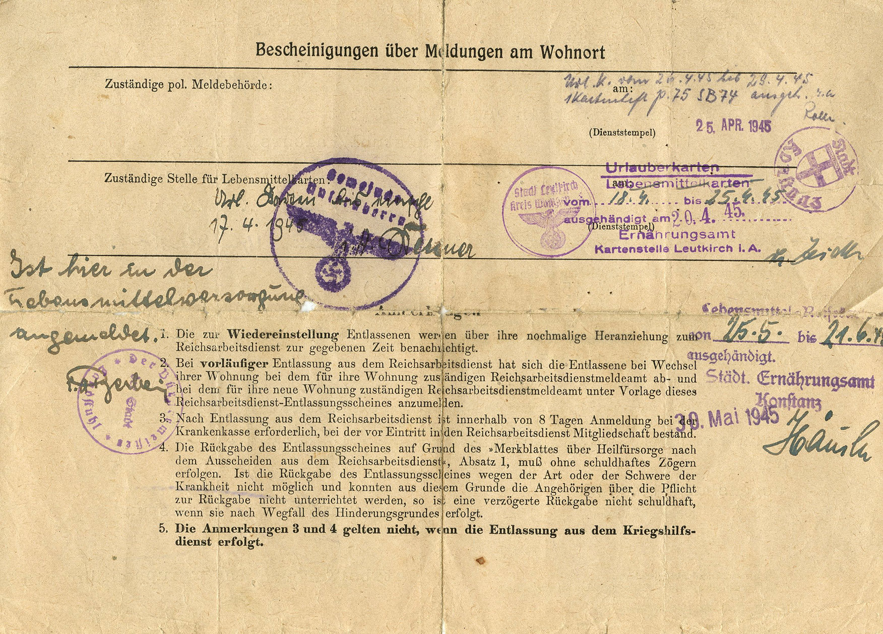[Below: The back of the discharge paper show a variety of dates and stamps, including those as late as June 1945, made by the occupiers after the war.]