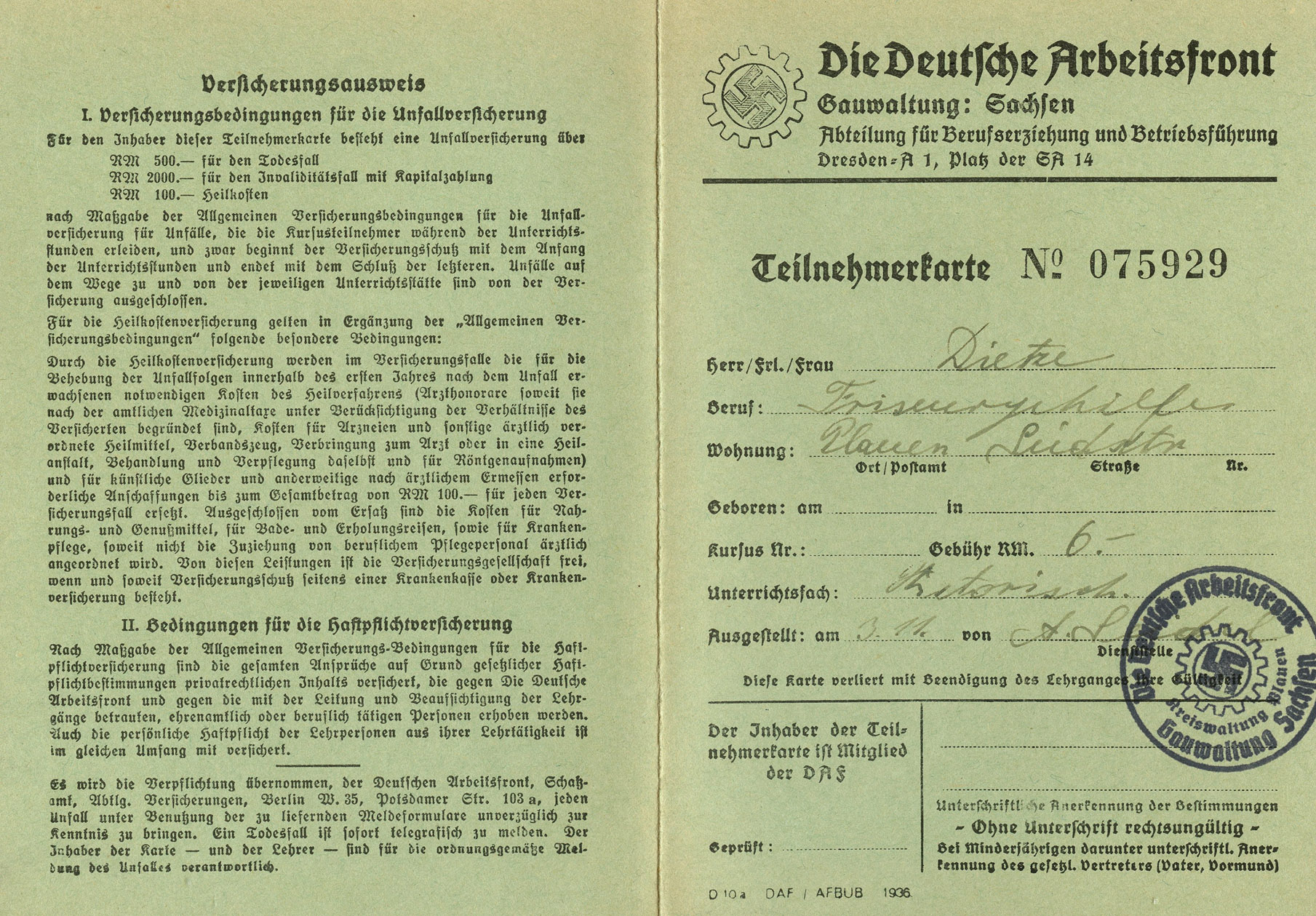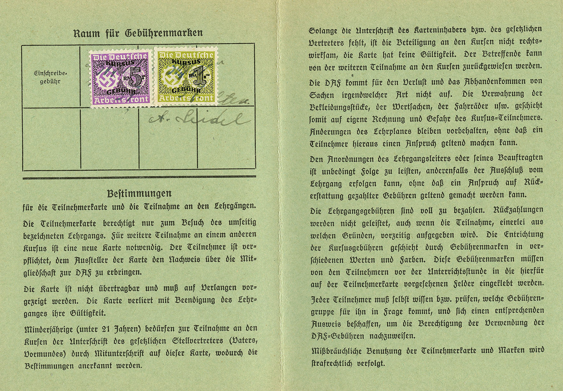 [Below: Close-up. 'Kursus Gebühr' (Course Fee).]