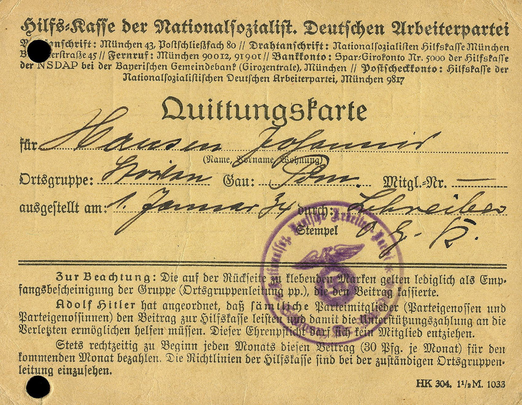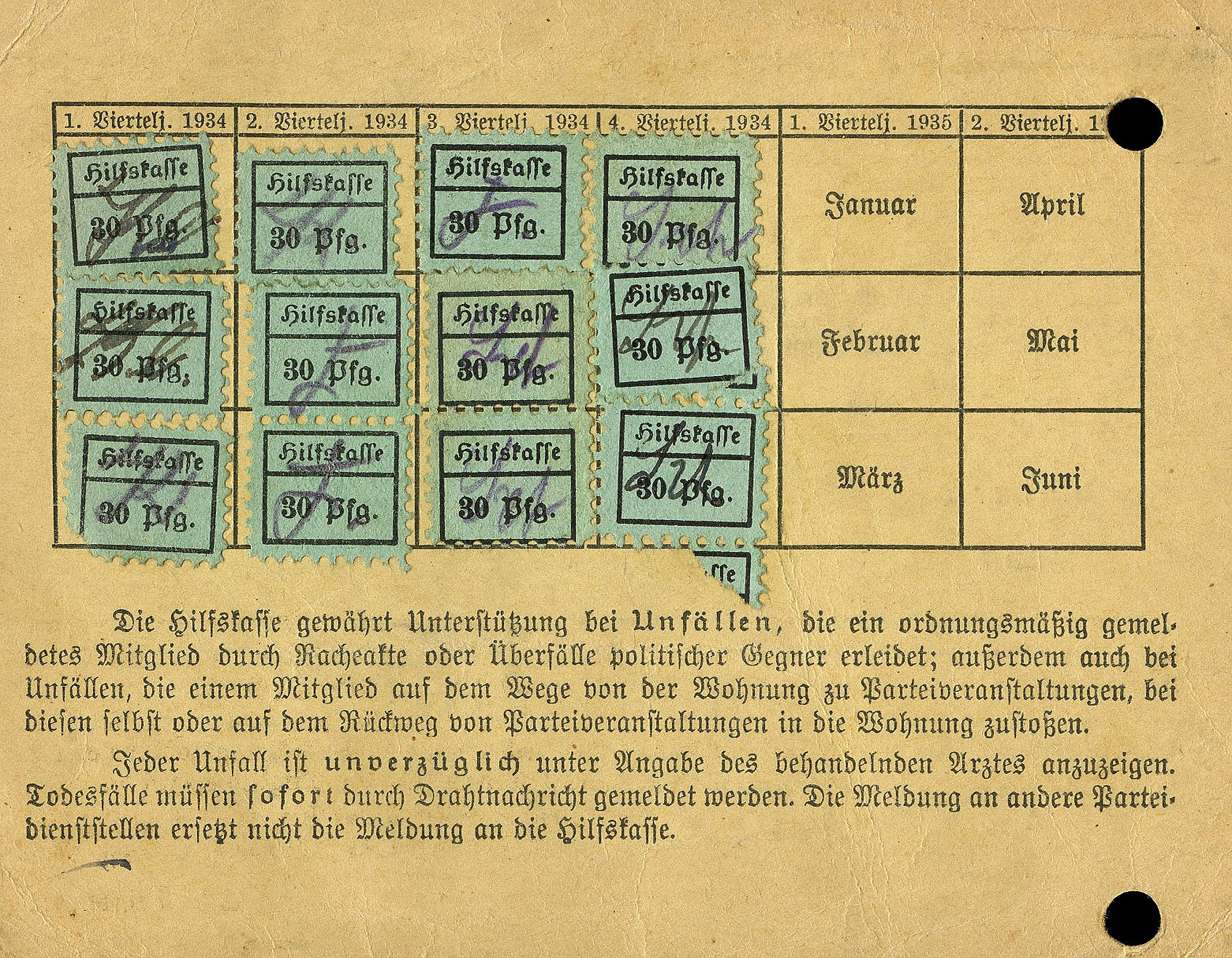 [Below: This is VERY interesting. It is an insurance card for party members for political violence or injury at the NSDAP party events. This really illustrates the dangerous atmosphere, even in 1934 after Adolf Hitler had gained power. It says: