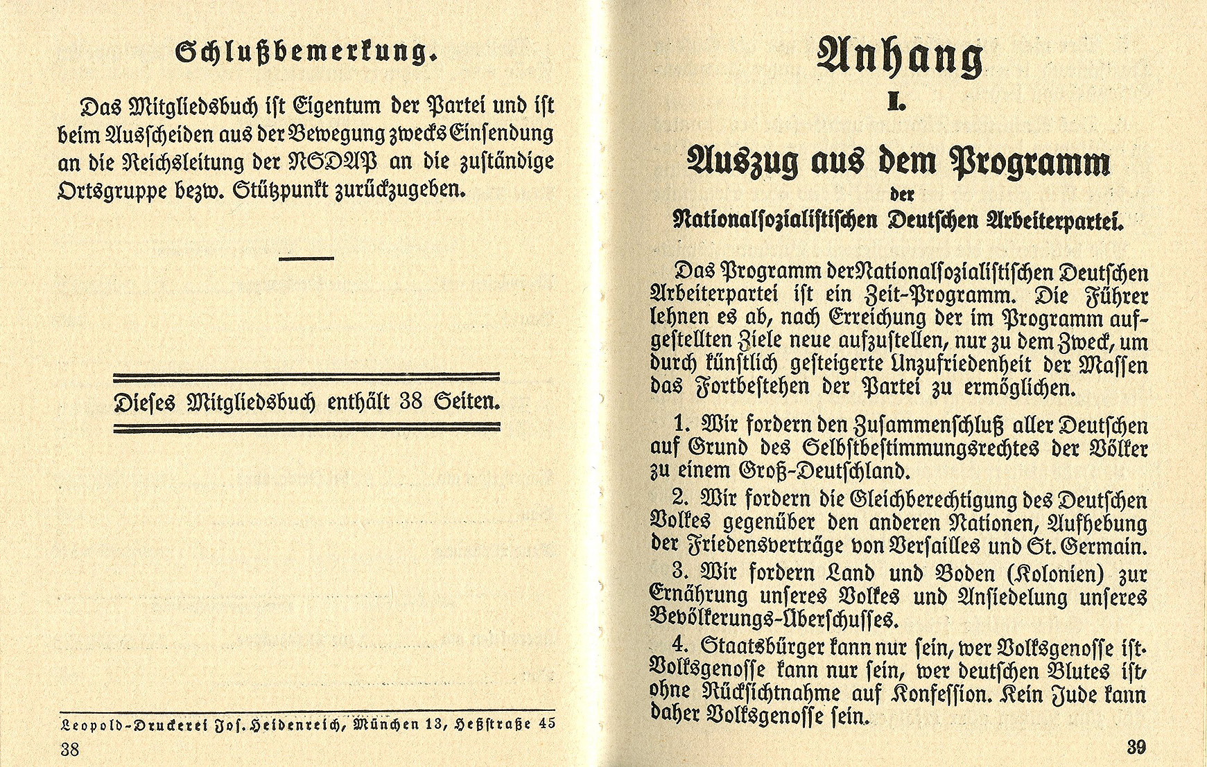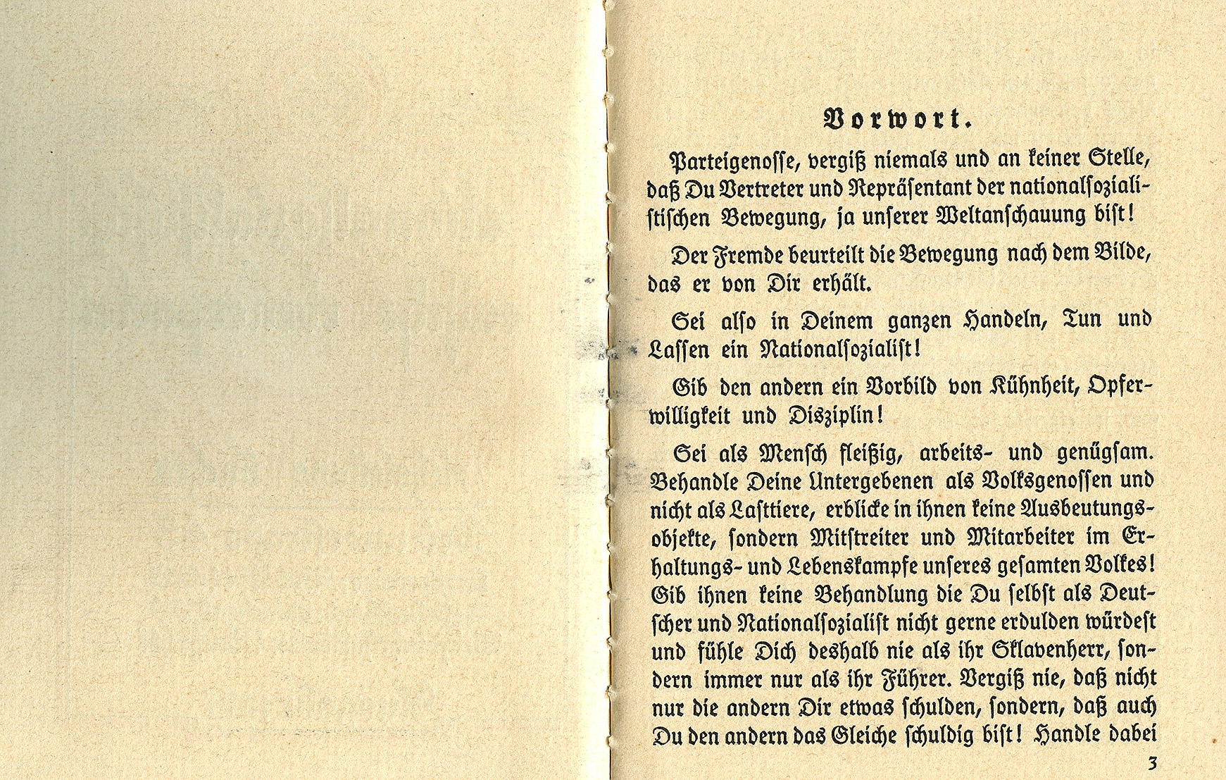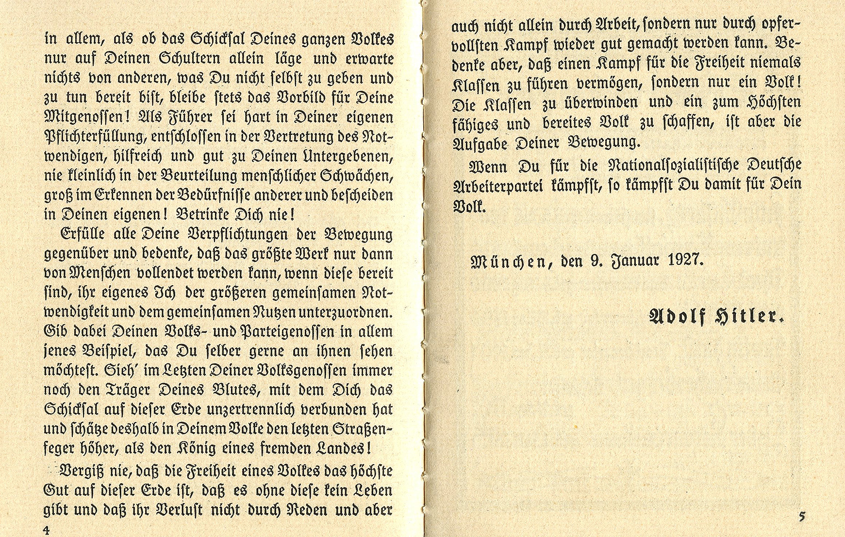 [Below: NSDAP membership book pages #1-2 - a foreword by Adolf Hitler.]