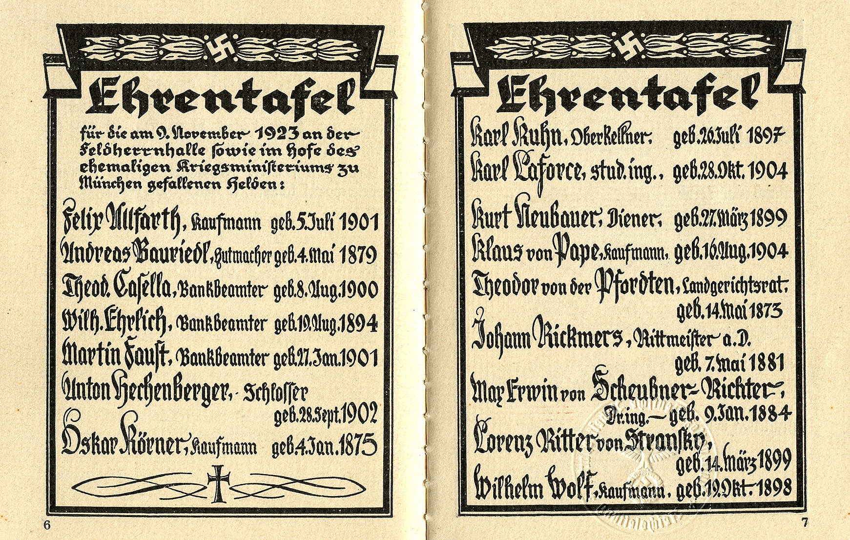 [Below: NSDAP membership book pages #5-6 - the list of the martyrs of the 1923 Putsch.]