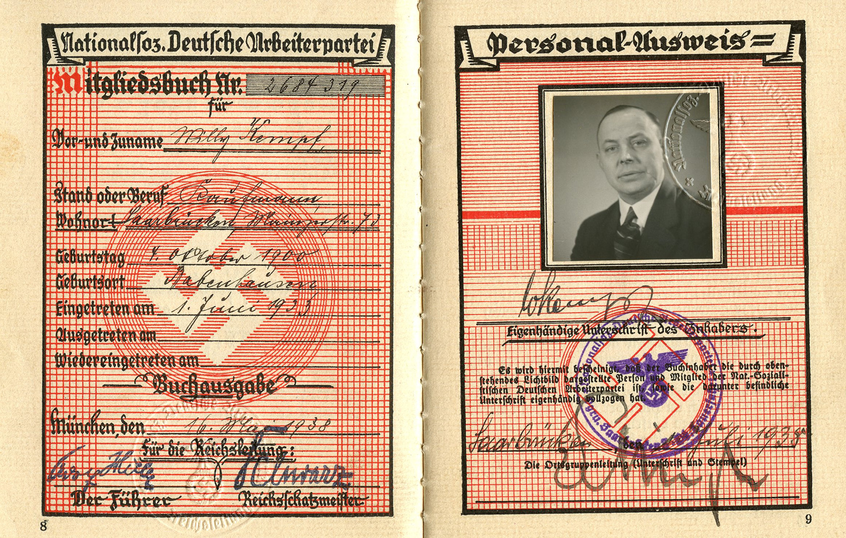 [Below: NSDAP membership book pages #7-8 - information and picture. Meet Willy Kempf. We see here that Herr Kempf was born on October 4, 1900, making him 38 years old when this book was issued. He was born in the Saar.]