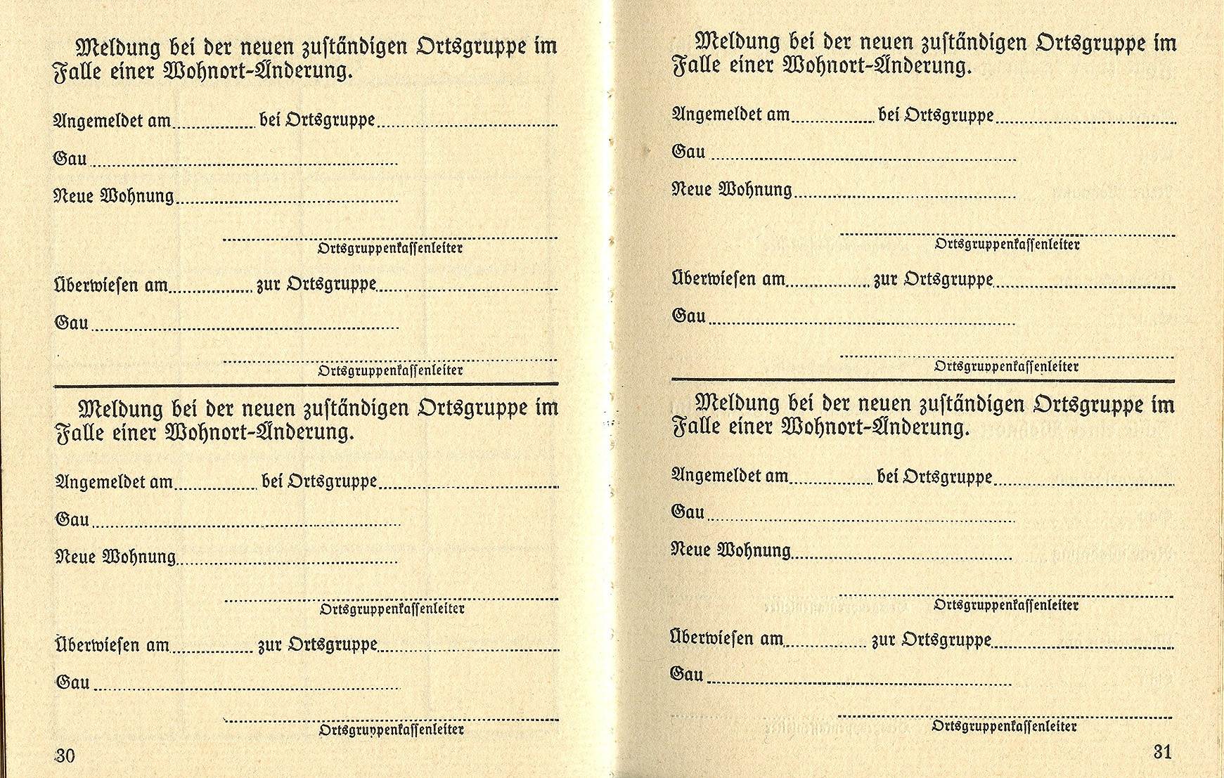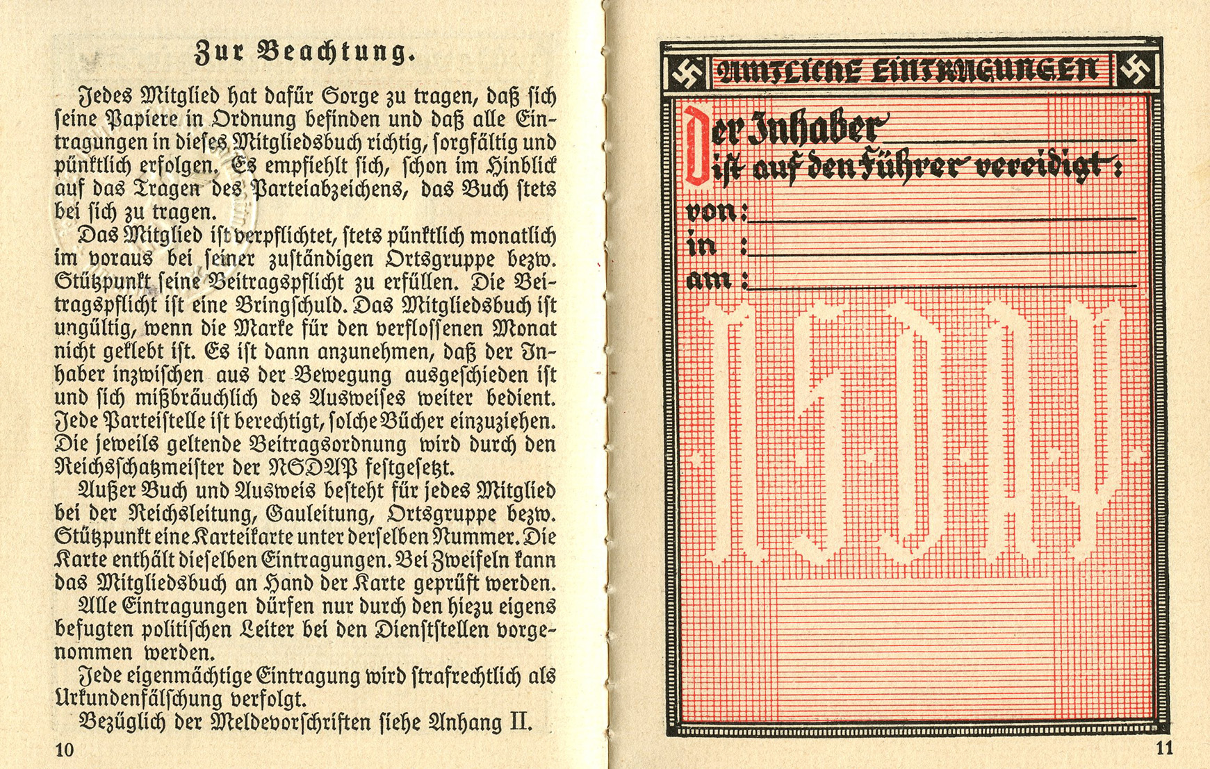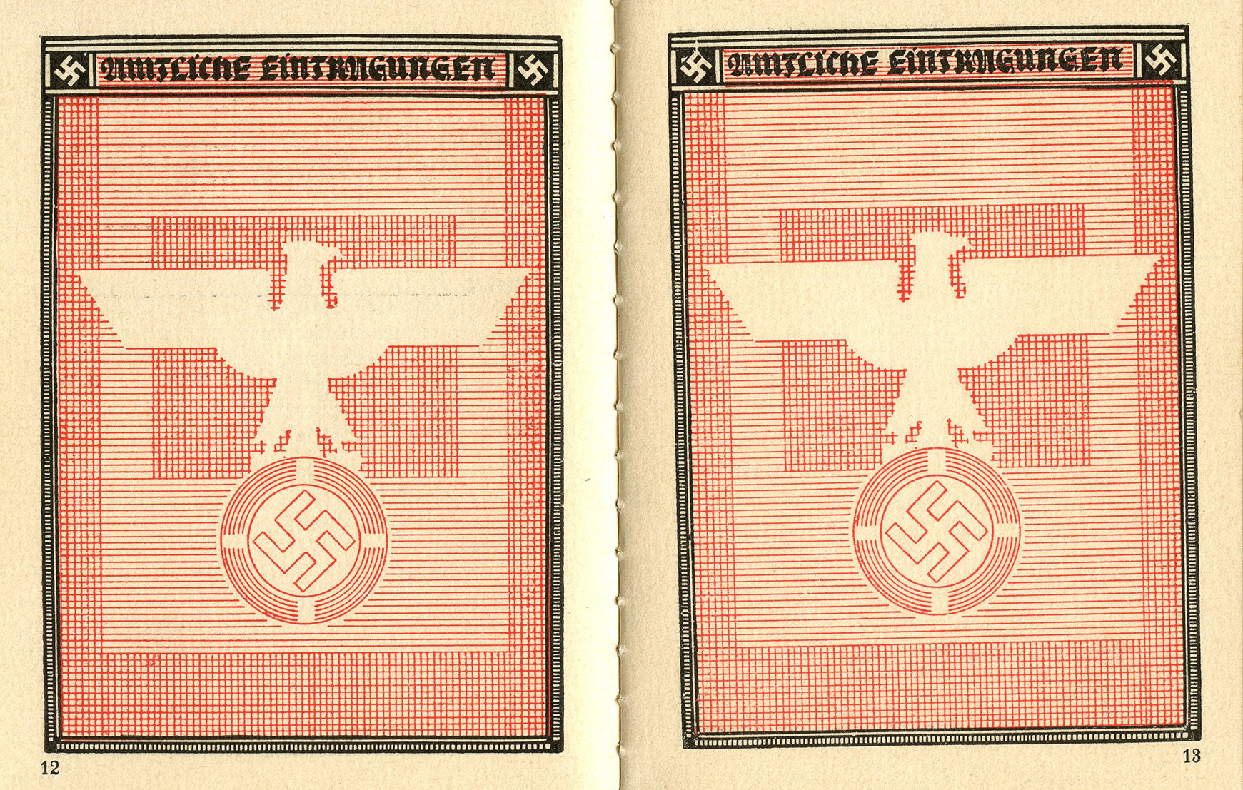 [Below: NSDAP membership book pages #11-12 - rather striking looking eagle design. Very tastefully done, like usual.]