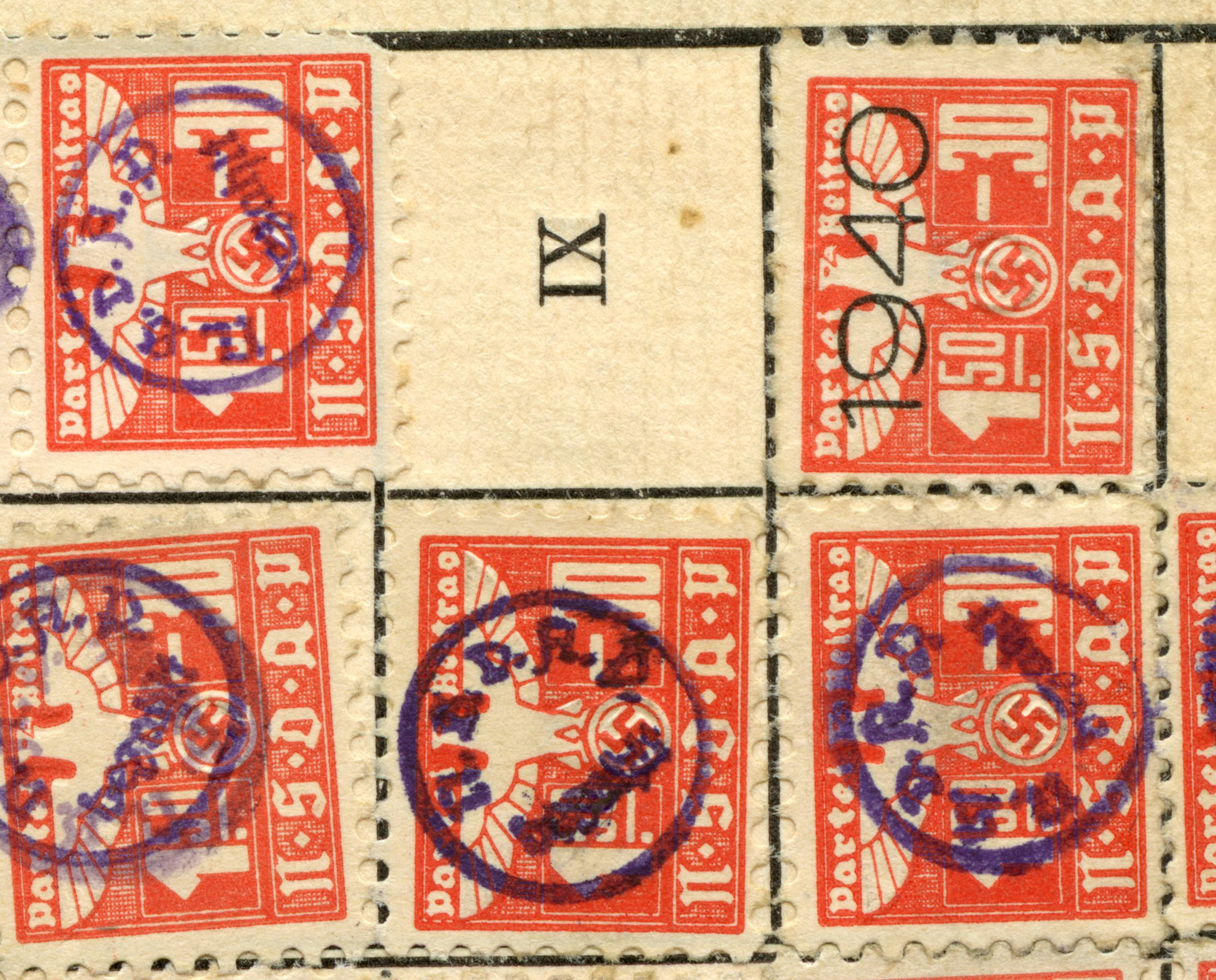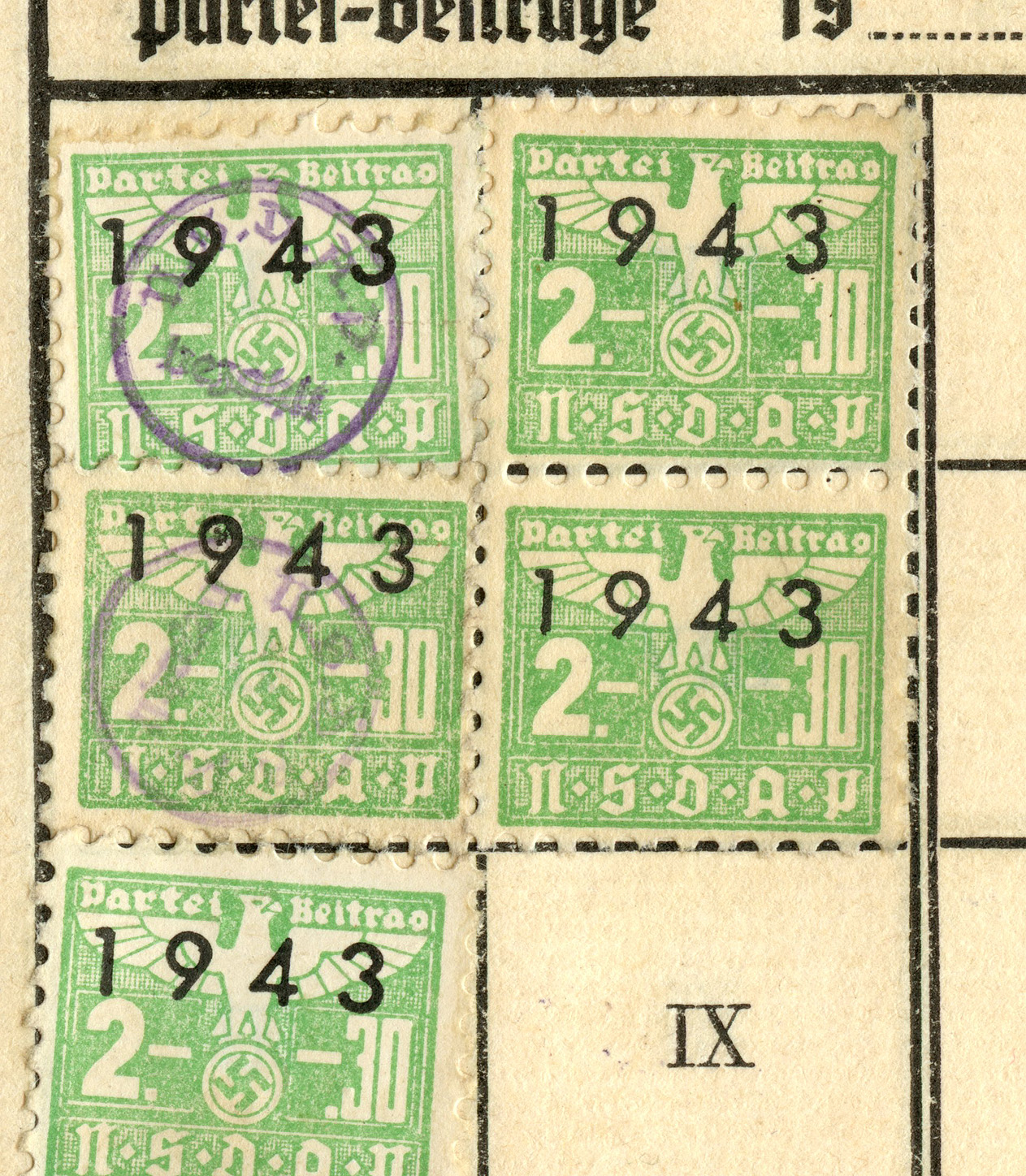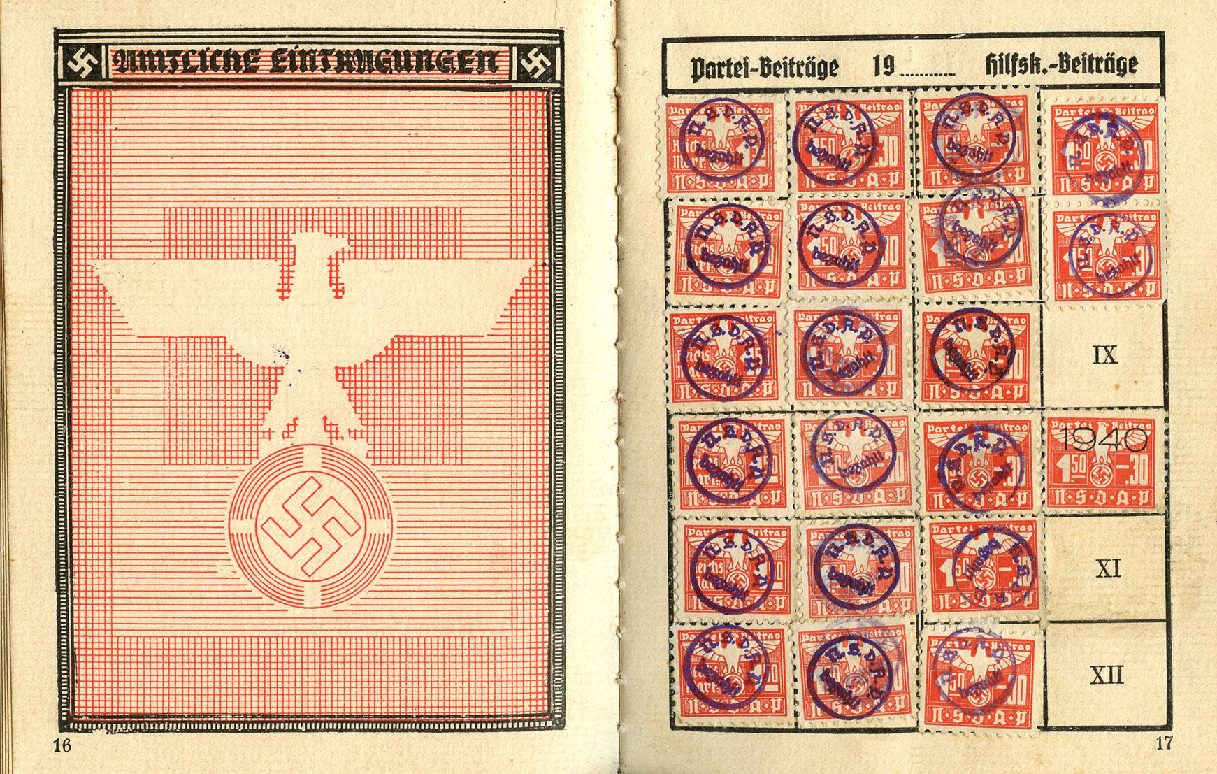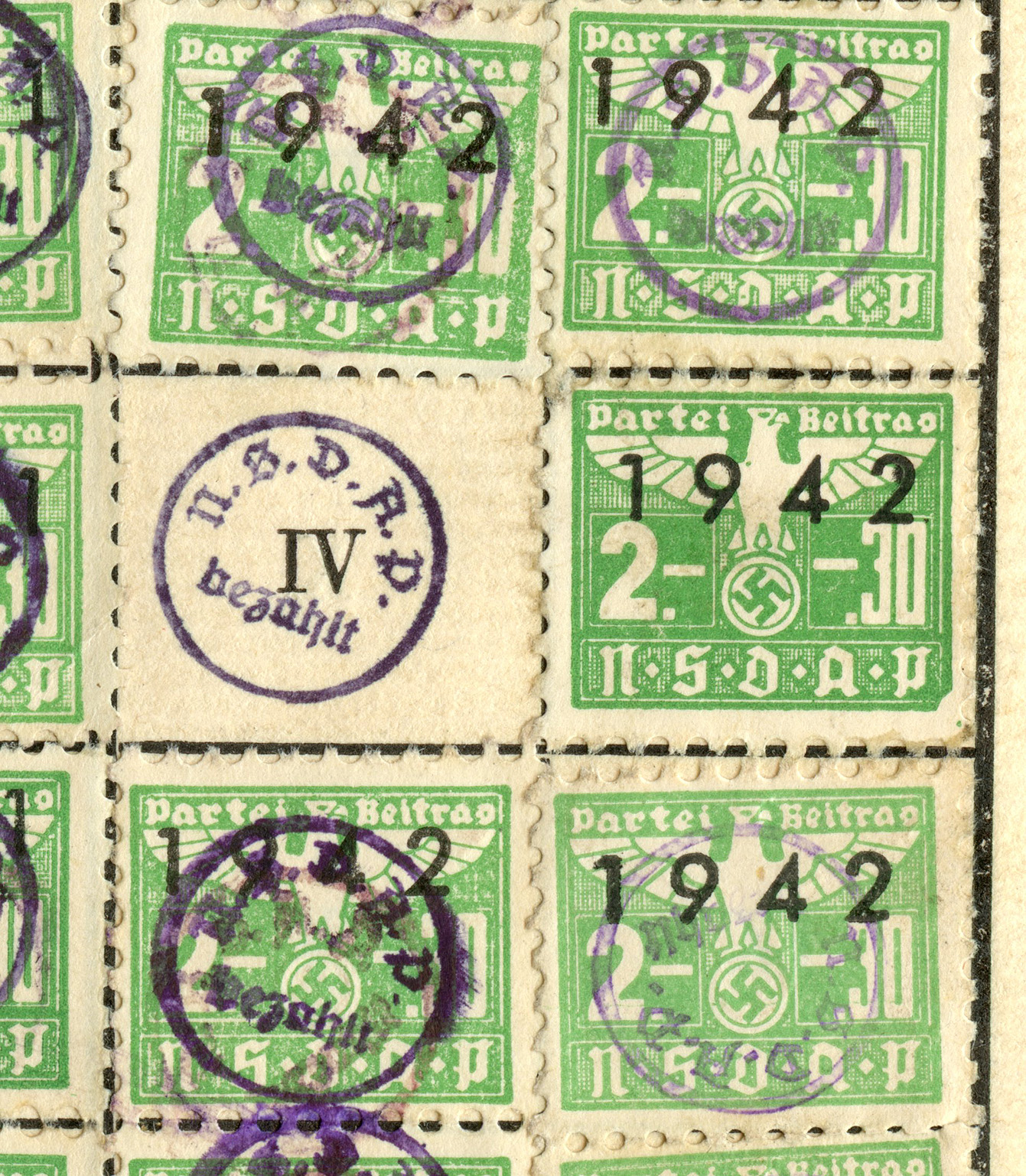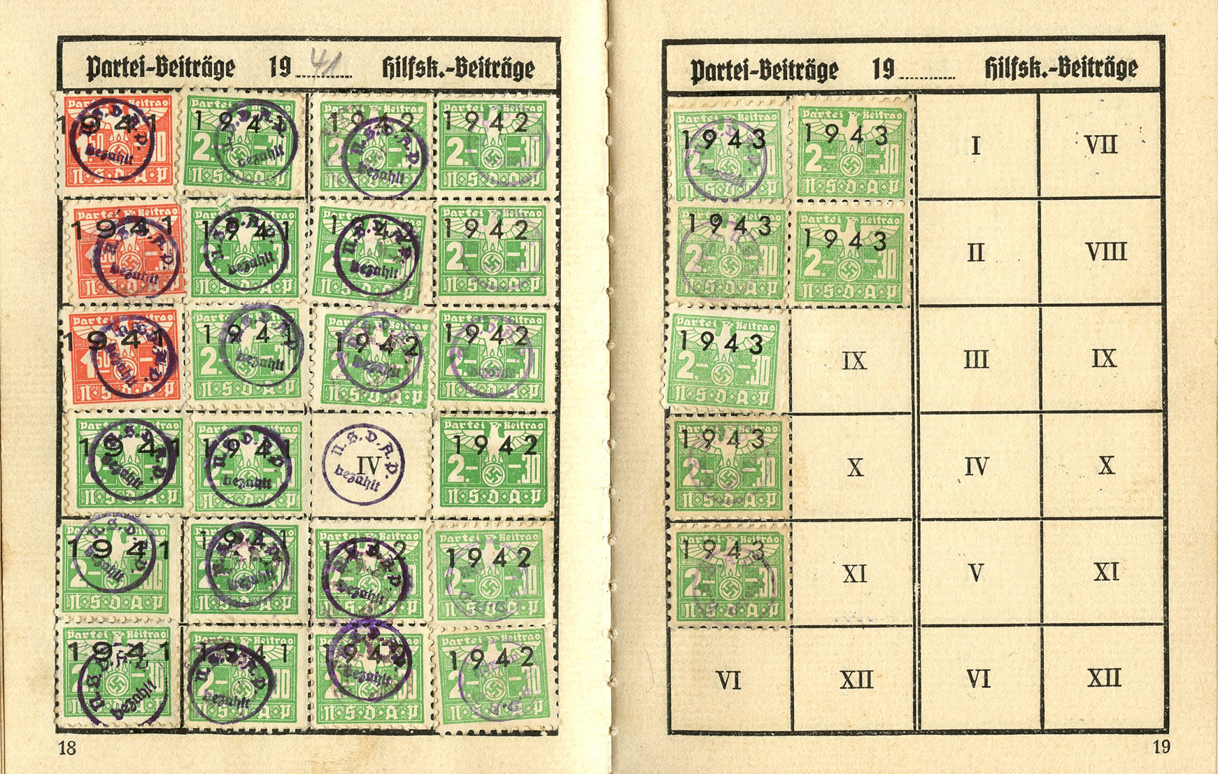 [Below: NSDAP membership book pages #15-16 - many more dues stamps, with overprinted stamps from 1941-1943. Oddly one of the spaces is missing a stamp and they just stamped it anyway.]