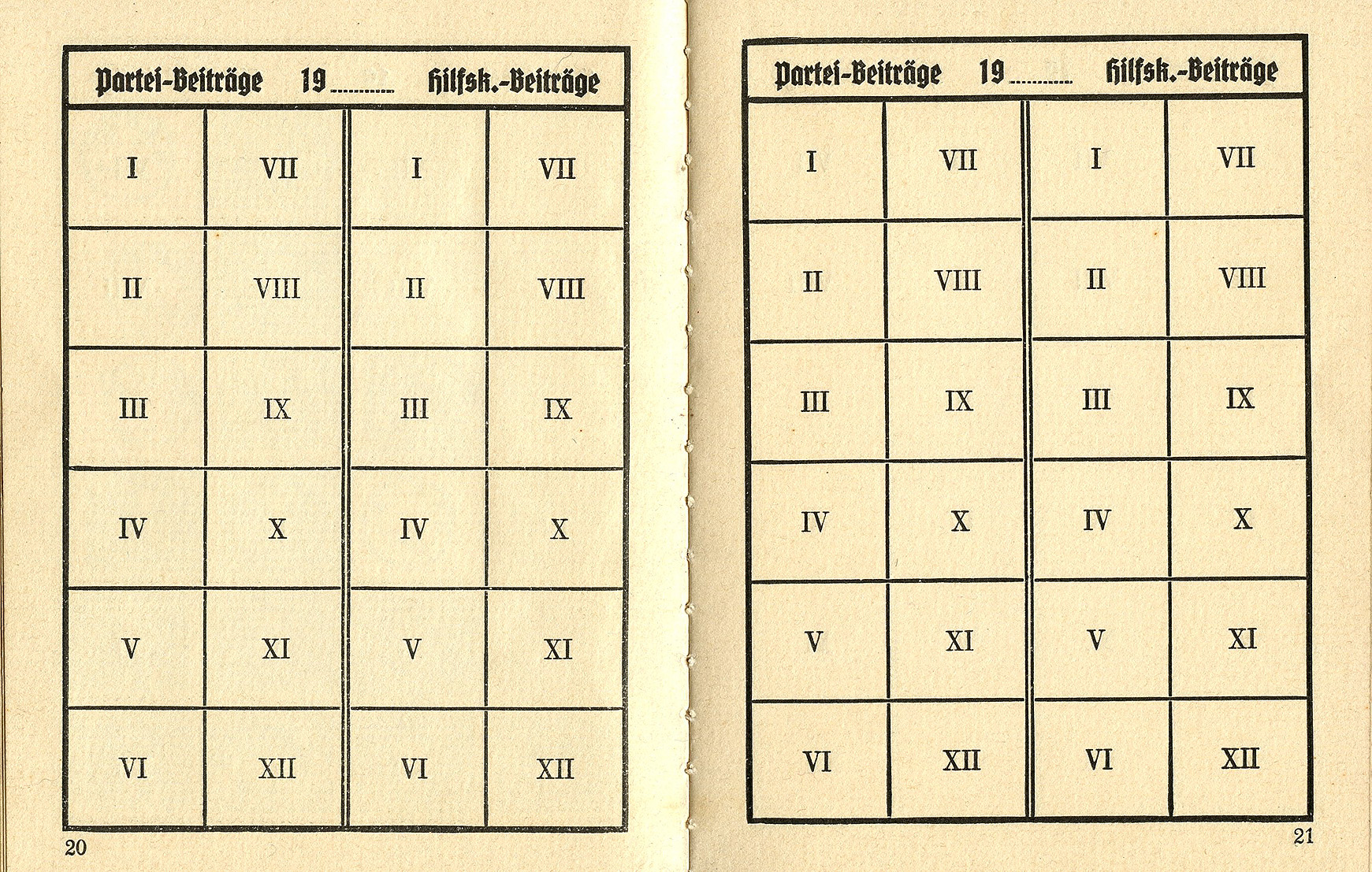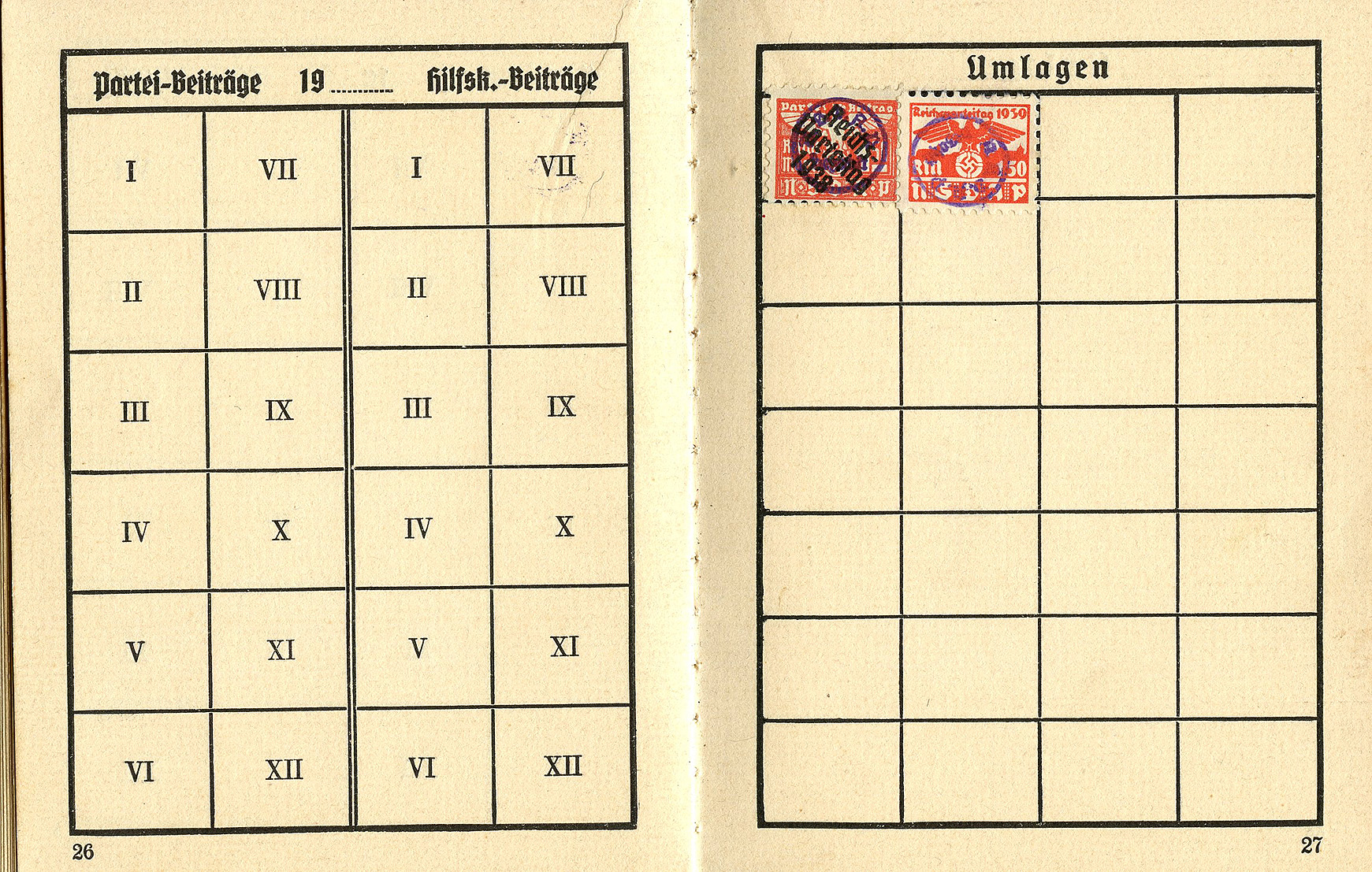[Below: NSDAP membership book pages #13-14 - a page full of membership dues stamps.]