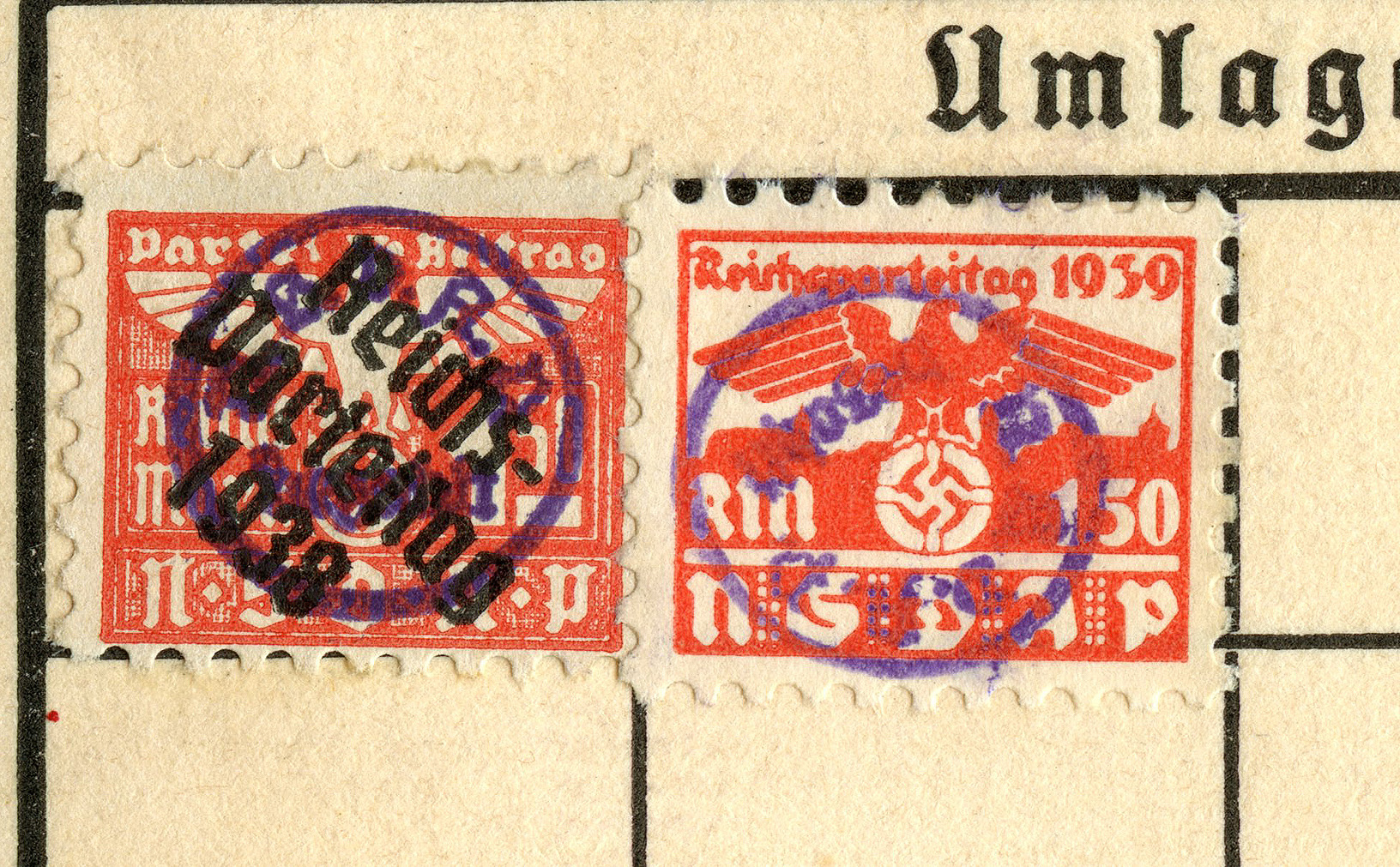 [Below: NSDAP membership book pages #19-20 - Party Day stamps! Members would get special stamps for attending the NSDAP Party rallies. We see here that Herr Kempf attended the 1938 and 1939 rallies.]