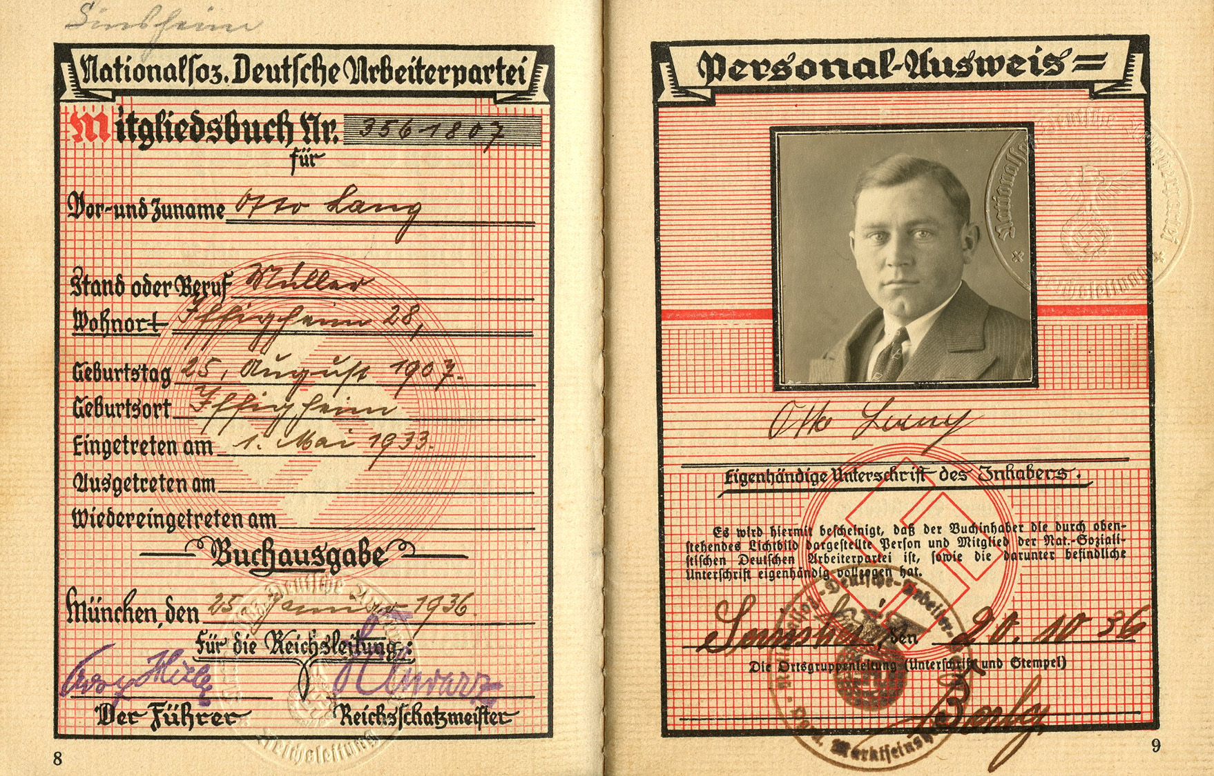 [Below: NSDAP membership book - Meet Otto Lang. We see here that Herr Lang was born on August 25, 1907, making him 29 years old when this book was issued.]