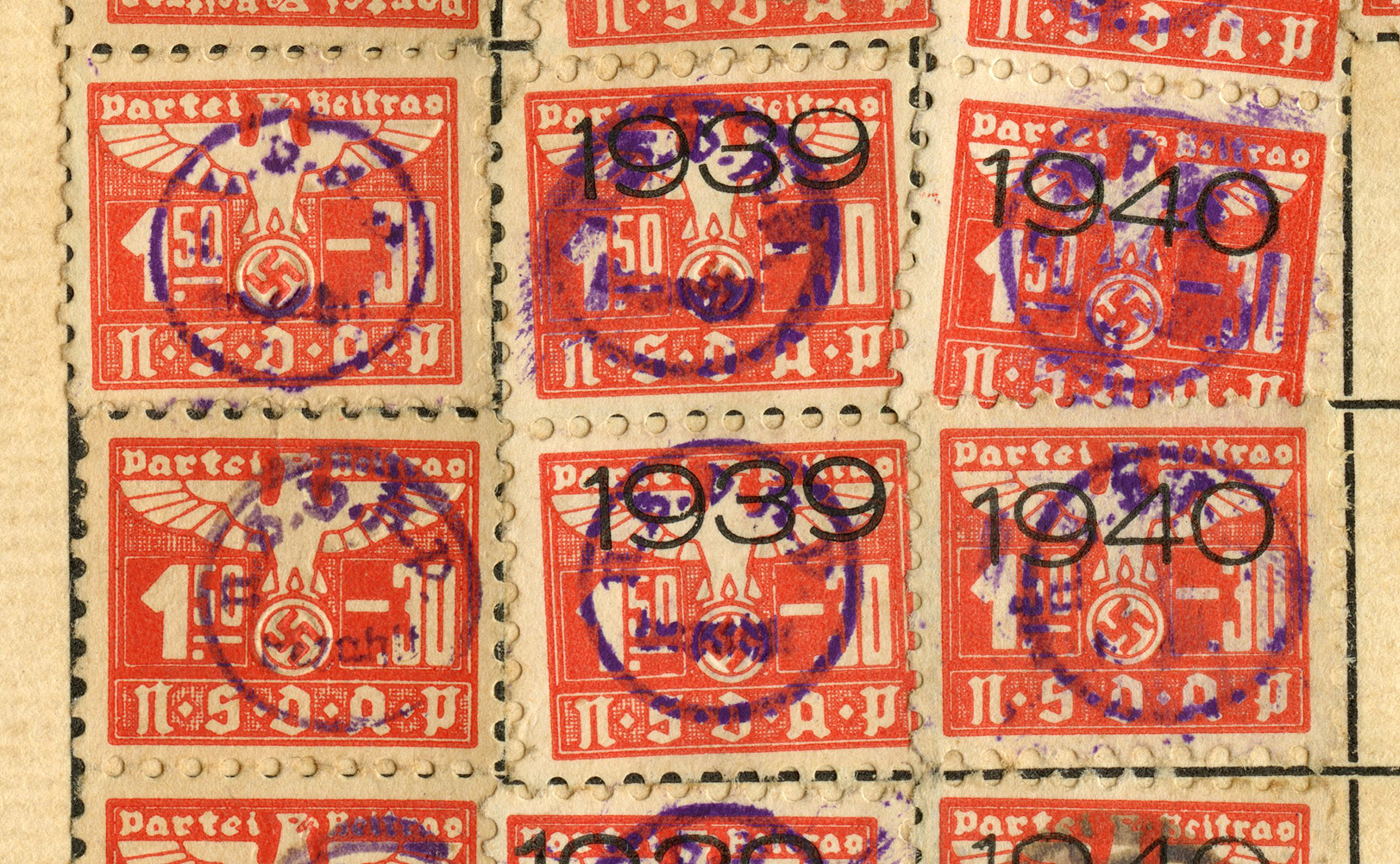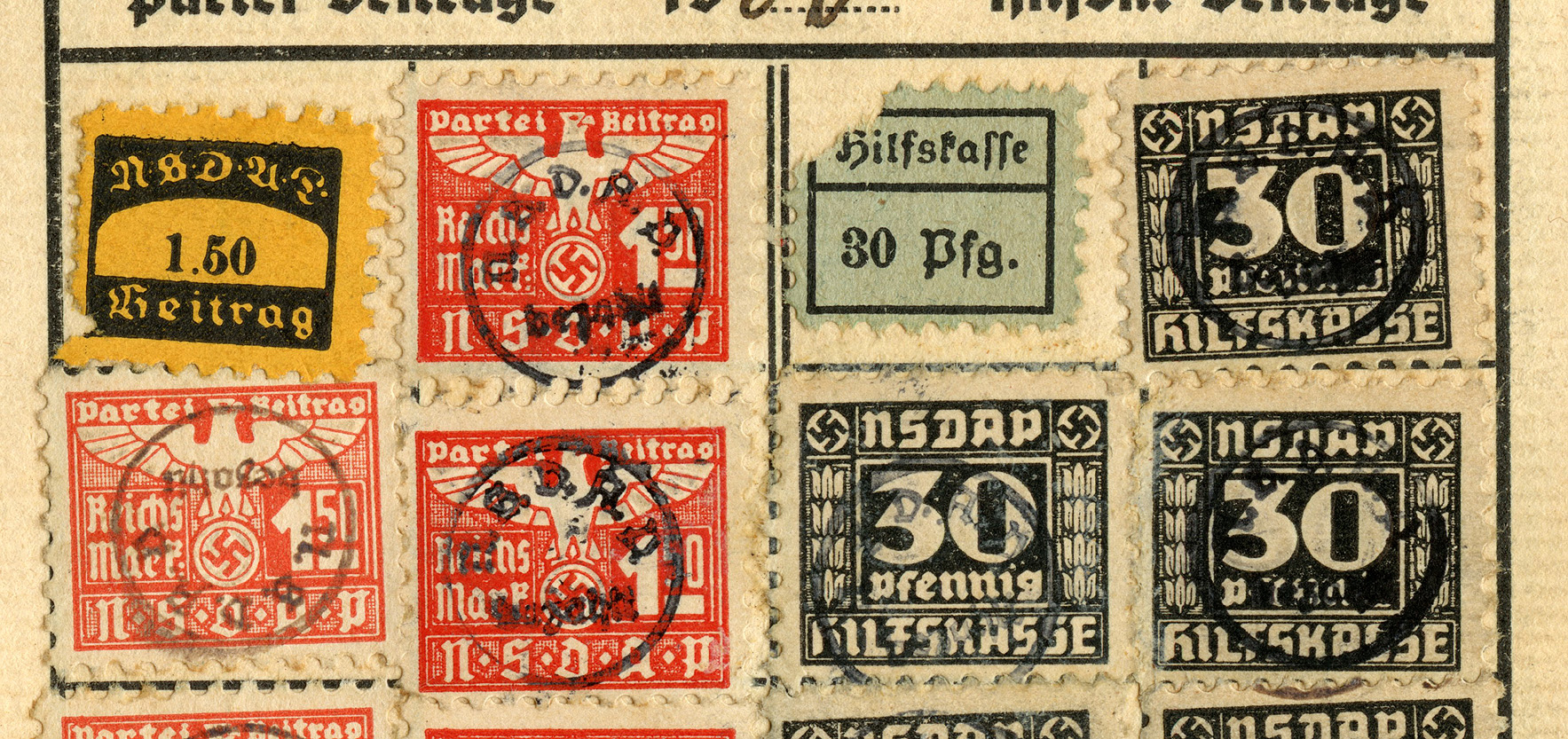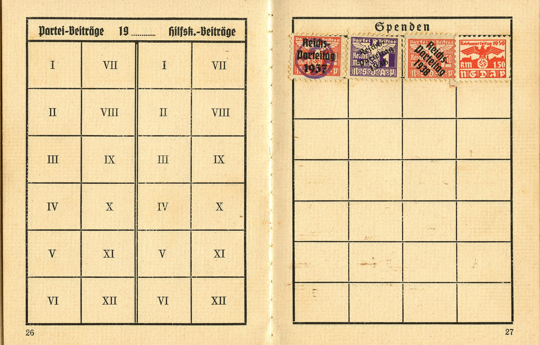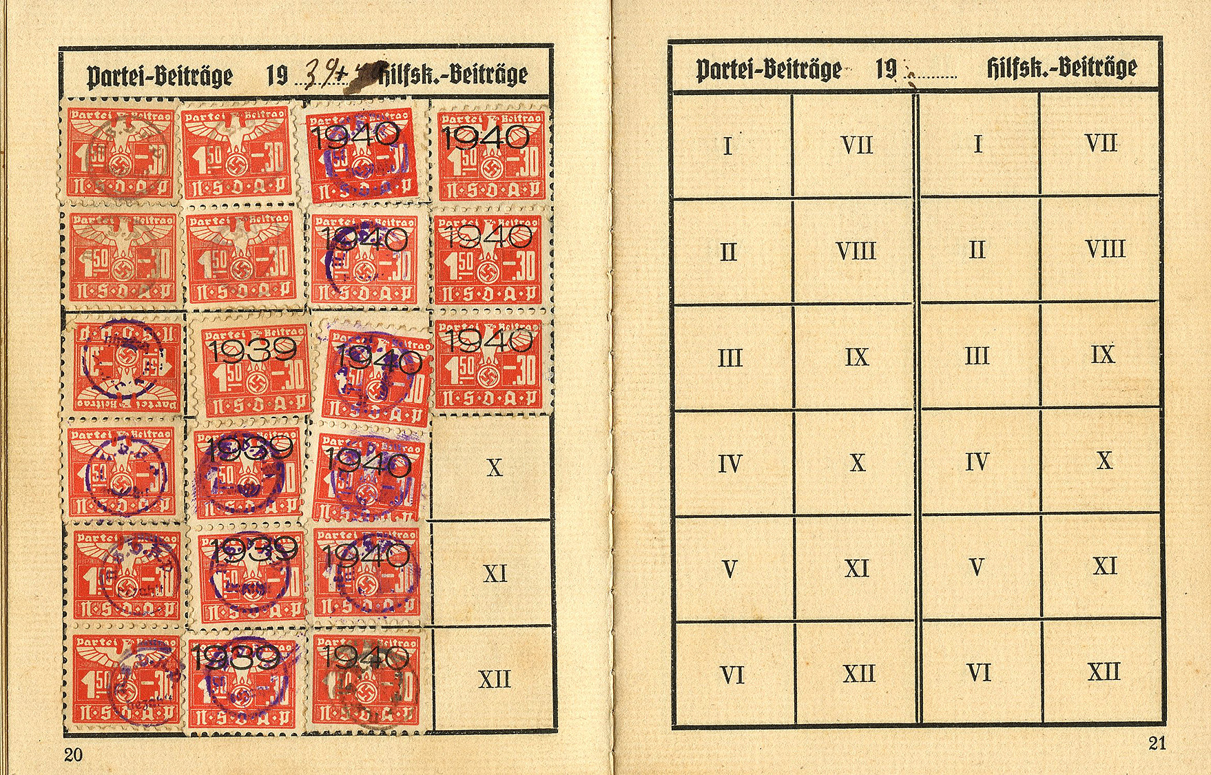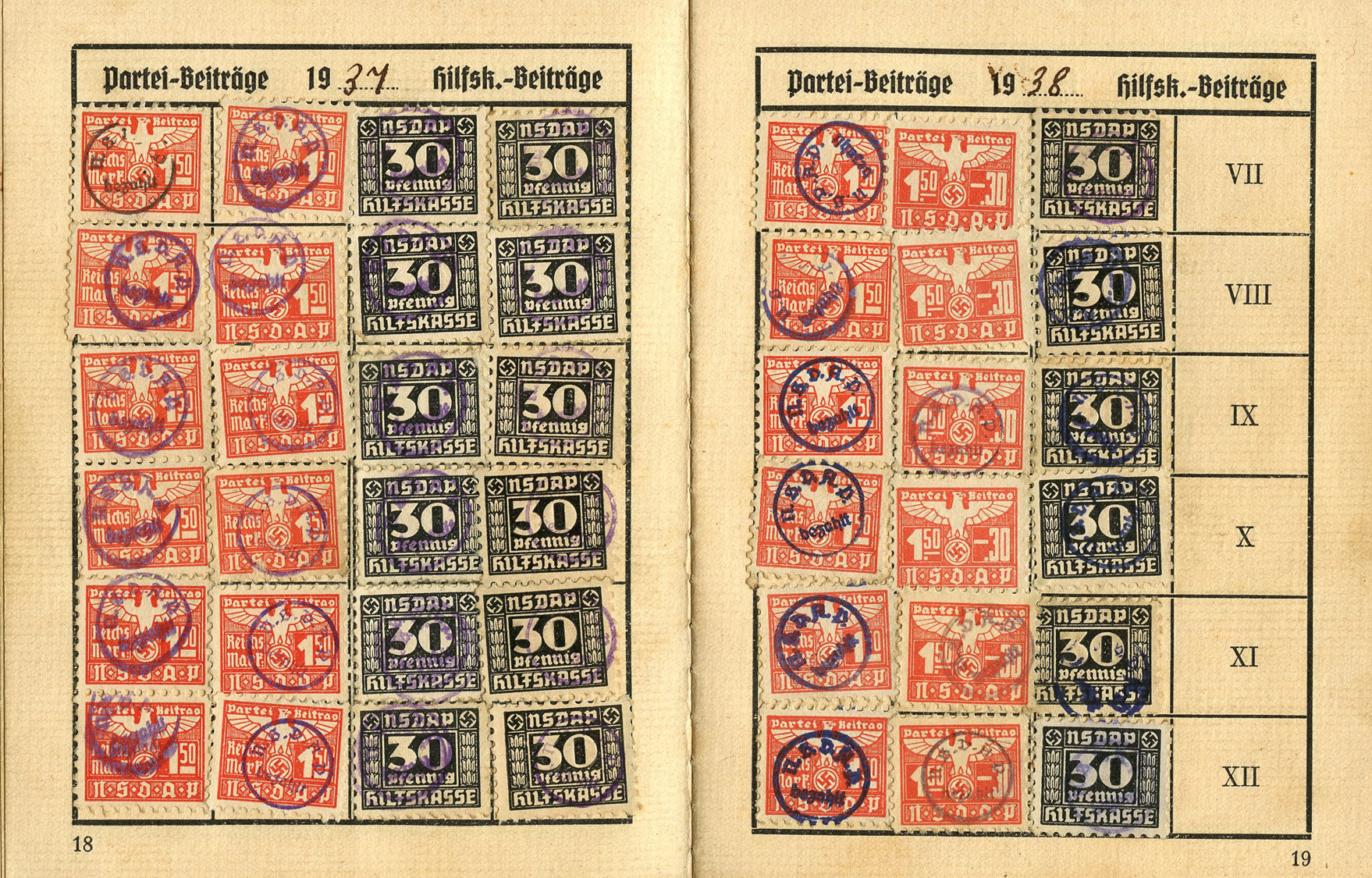 [Below: Wow, some very interesting NSDAP dues stamps, very different from the other NSDAP party membership book.]