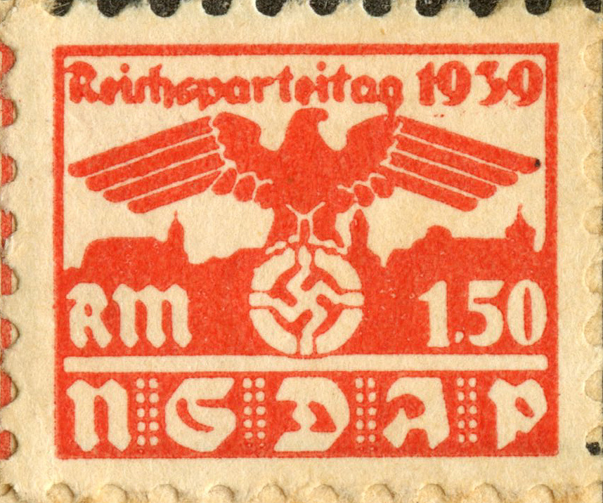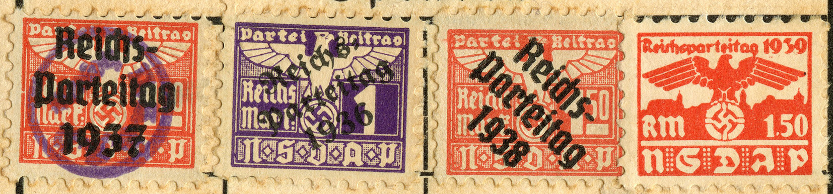 [Below: Wow, very cool, four Party Day stamps. Herr Lang attended the 1936, 1937, 1938 and 1939.]