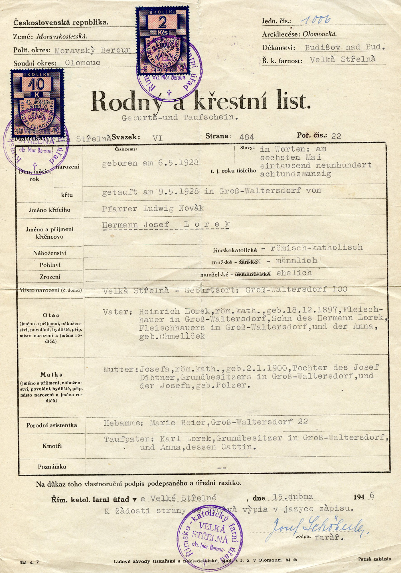 [Below: Document with Czech tax stamps. It says: 'Geburts-und Taufschein' (Birth and baptism certificate).]